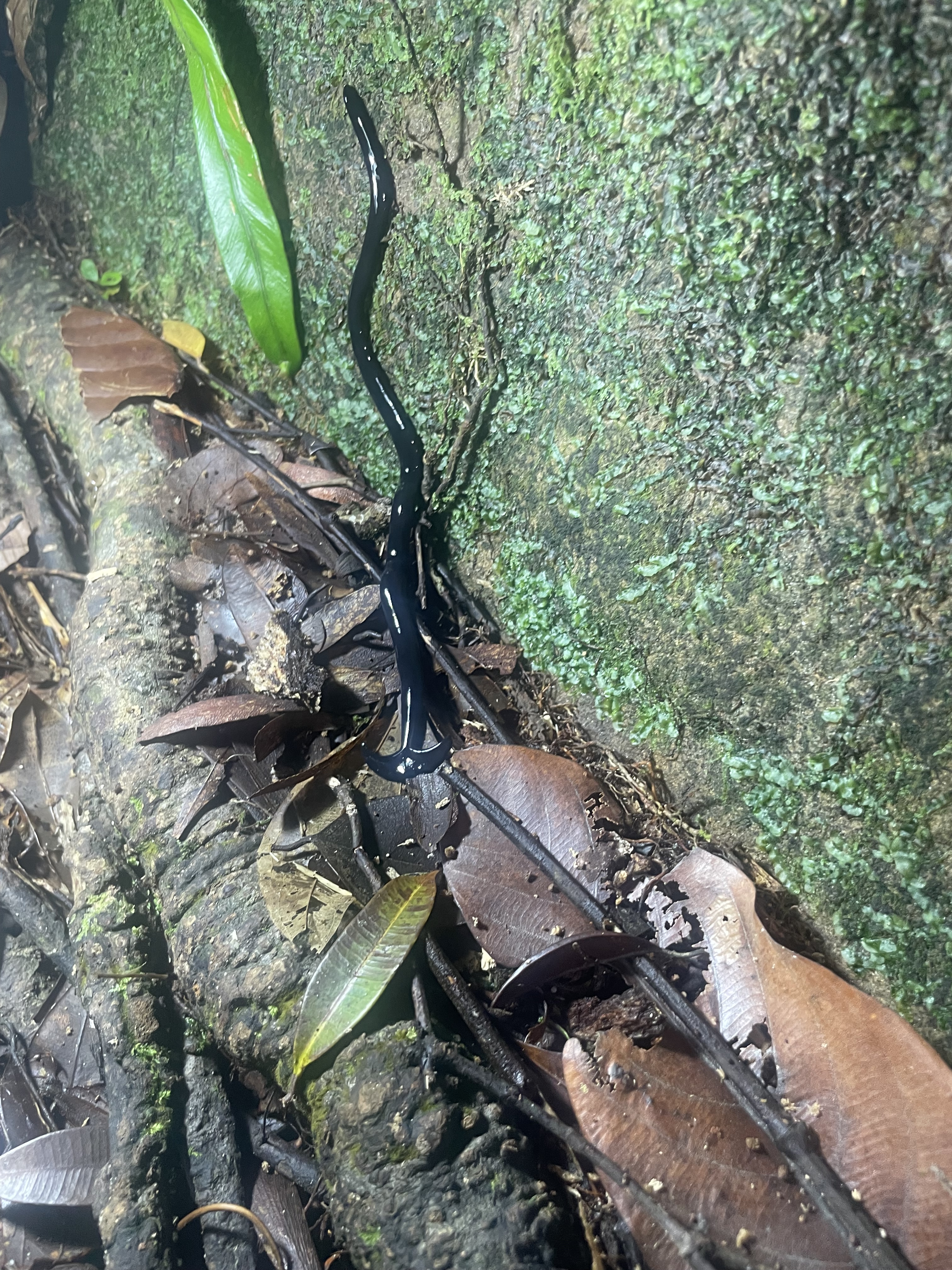 We met our guides, ‘Chief instructor’ and ‘Instructor’ were written on the back of their yellow T shirts. They had strong torches, making our head torches seem very feeble indeed. Still, we were ready, trousers tucked into socks, and ‘Good morning’ towels wrapped round our necks. It was pitch black and at the entrance to the trail, ‘Instructor’ stopped us and pointed to the large flat leaves growing about him and which lined the path. ‘Don’t touch those, don’t go near, keep in the middle of the track, pit vipers sit there. Very lazy snake, they can stay there sometimes for a week waiting for prey. They lie in an S shape like a spring with their tail wrapped around the stem, ready to leap and bite a bird or lizard. If you are bitten you can be saved with a serum within thirty minutes, but the hospital needs to know what type of snake it is so they can use the correct serum. OK, let’s go.’