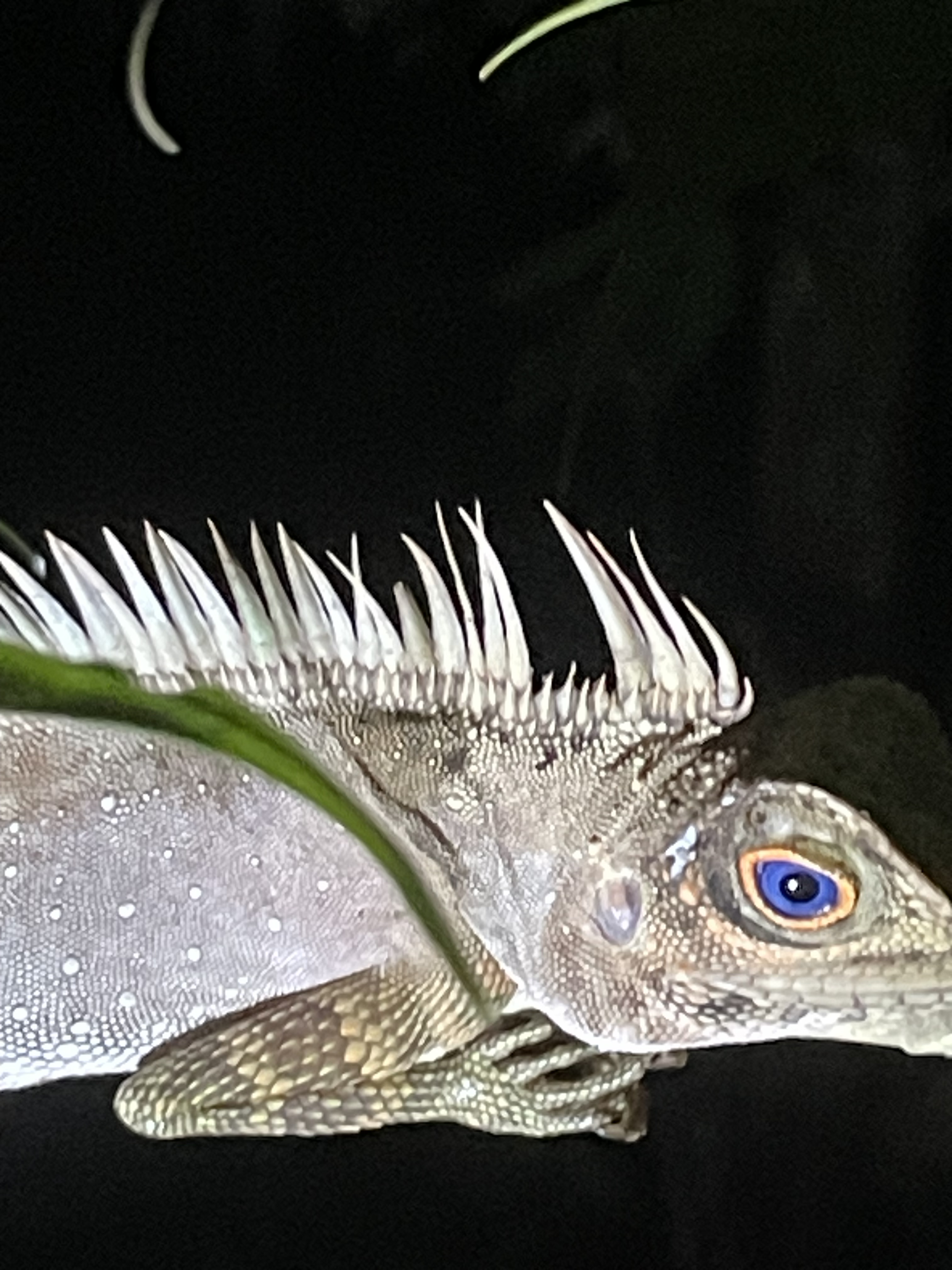We climbed over fallen trees, insect-eaten branches, crossed a river on wobbly, slippery rocks, hanging on to a guiding rope. Around us huge trees grew up harbouring further creatures. On the ground we encountered a ghost crab, scorpions and worst of all a hammerhead worm with its long black slimy body. A huntsman spider poised on a branch and a large tarantula crouched in the cosy base of a tree, totally camouflaged amongst the leaf litter. I particularly liked the blue-eyed angle-headed lizard. We saw a few of these and they didn’t seem to mind their tails being twitched.