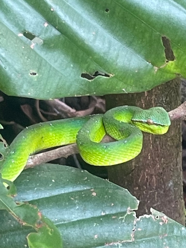 The night walk was a revelation and gave us a suitable frisson of fear and we were delighted to have seen the insects and small creatures that we did. The next morning, we walked down toward the beach and saw our two instructors. ‘Chief instructor’ called us over and took us to a plant with big wide leaves, just at the side of the road. There, poised and ready for action was a pit viper! Oh my, it was so bright and beautiful.