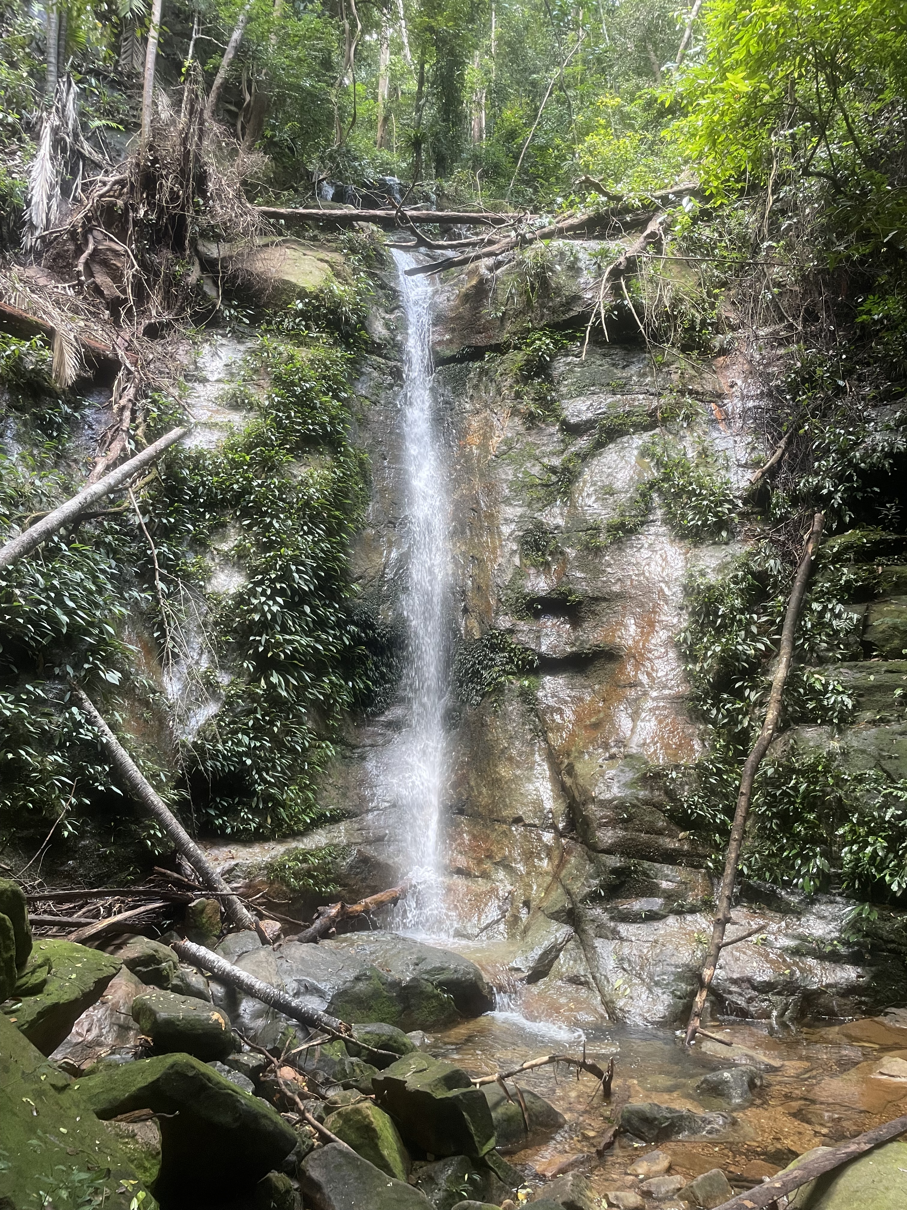 We trekked through the forest to the waterfall yesterday, and it was quite challenging although we have done it twice before in previous years, but each time we struggle with the heat and humidity as we scramble ever upwards through the trees, looking down to the level of the ants. We didn’t see any of the insects we saw the other night by torch light. In fact, we saw very little wildlife, but we had to stay alert for twisted vines and fallen-down insect-infested tree trunks that we had to climb over or duck under.