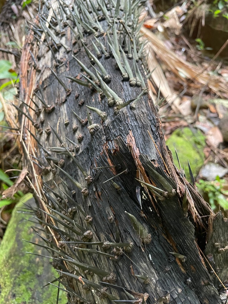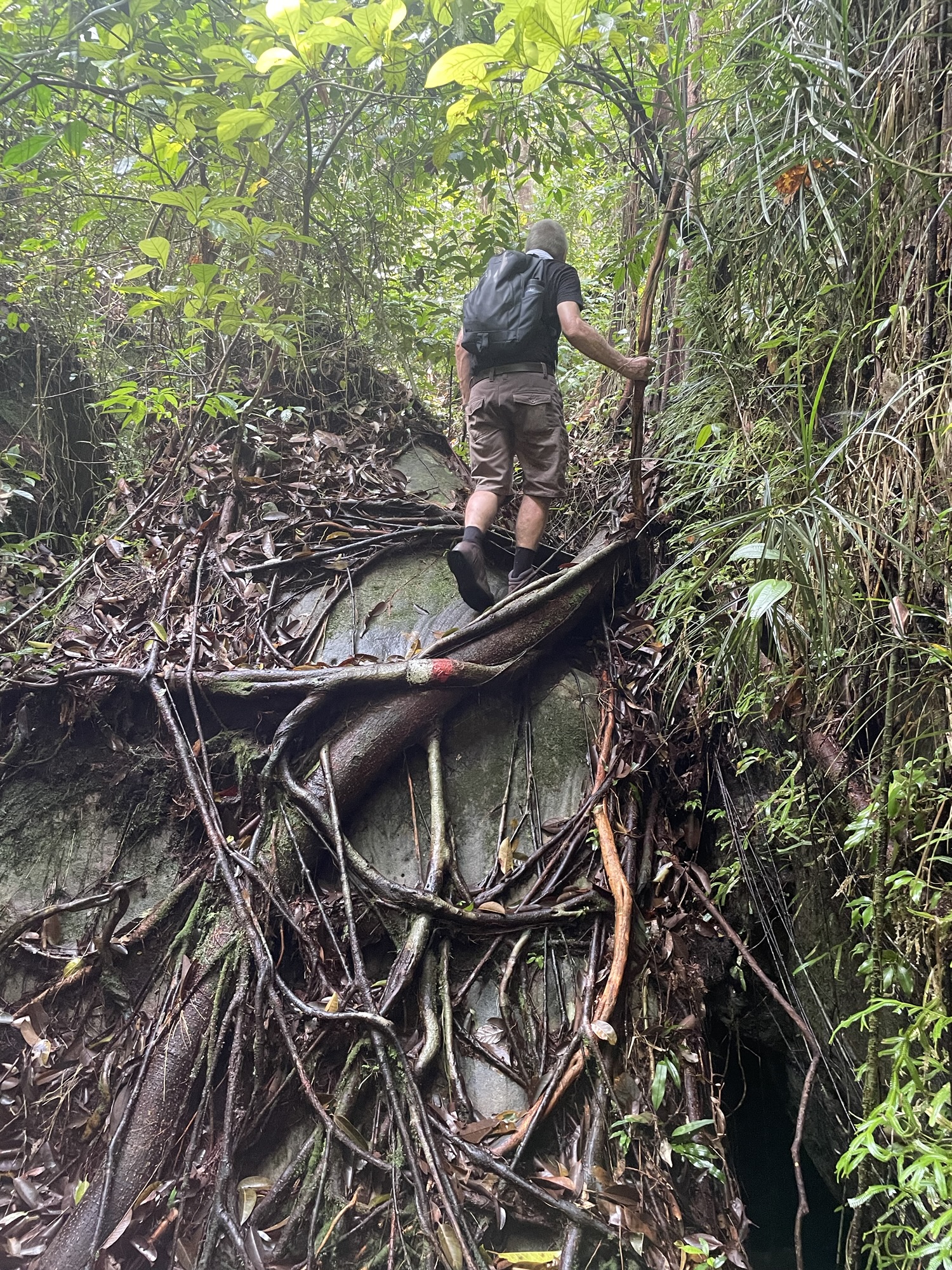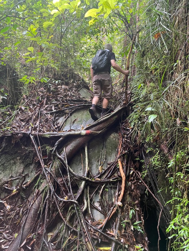 John got snagged on a spike from the rotan. Horrible things, but the rotan’s diversity is amazing for survival in the forest. ‘Chief Instructor’ demonstrated how two successive slashes on a branch, about half a meter apart, can trap the water between the severed cuts. You must do this quickly because if you don’t, the tree will suck up the sap like a straw and there will be no water to stave off your thirst.