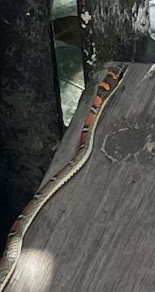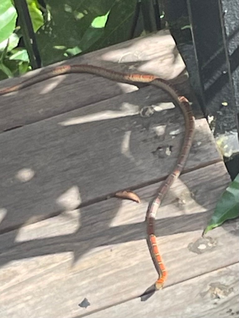 We drank fresh coconuts before returning to our treehouse. Imagine our surprise when we were treated to a visitor on the steps, a paradise tree snake idly basking in the sunshine. As we approached it wriggled into a multiple group of S’s and went over the side. They can glide from tree to tree it seems.
