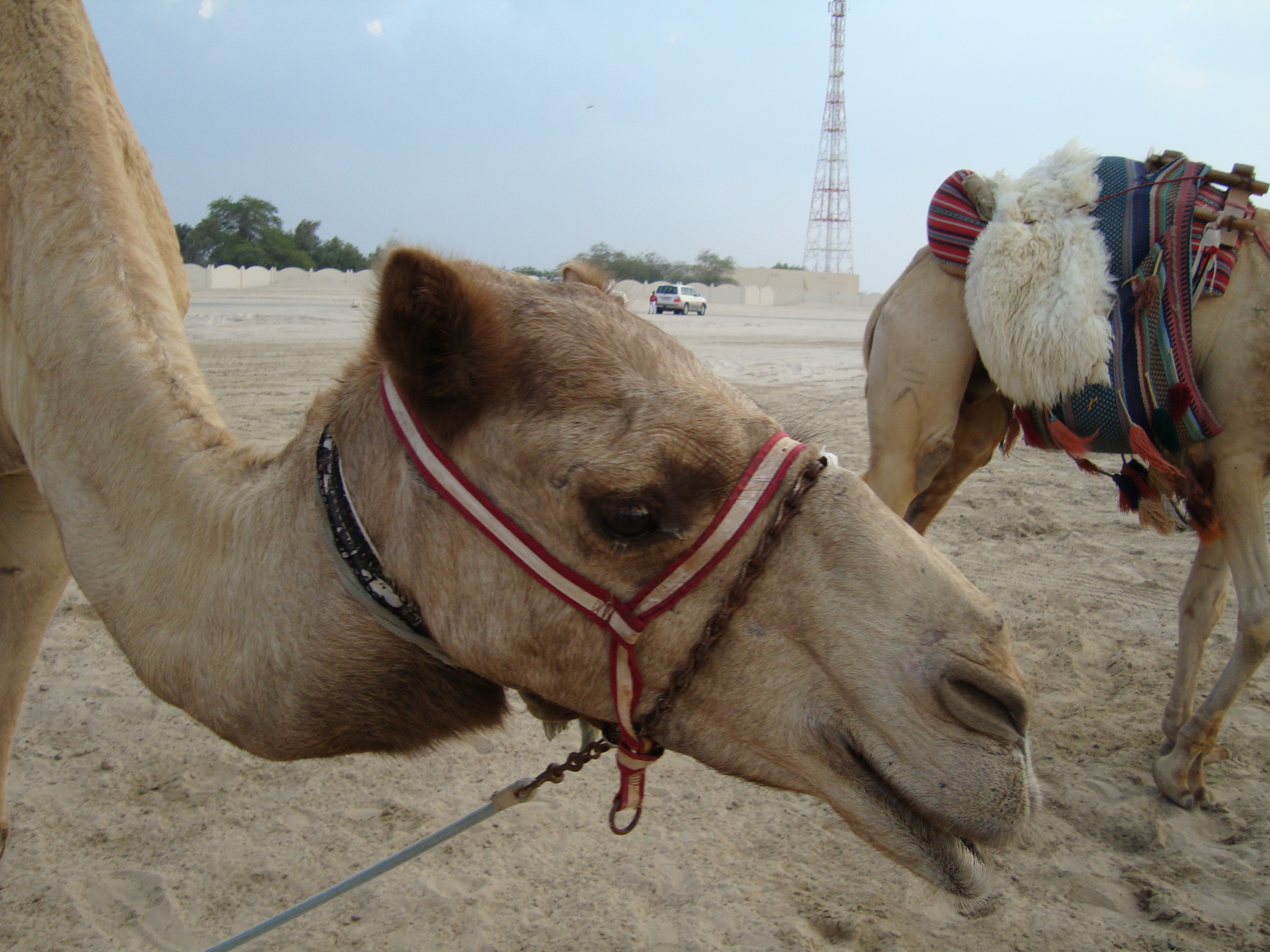 John and I have been doing little scenic drives out to the desert on Fridays. So nice to see the sand for miles (!) and the mirages on the road and yesterday we drove right across the country to a beautiful beach on the other side. A lot of the area was sectioned off for Qatar Petroleum, and we saw pipe lines snaking across the desert for miles, and the occasional Derrick burning off the gas (I think that’s what they were). The most common sign was Photographing is Forbidden…plus the odd sign depicting a camel.
