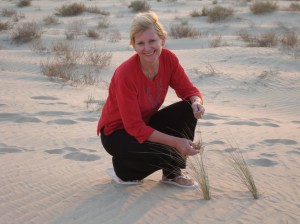 and tried to emulate him by searching for a flowering plant that I saw whilst speeding along. While Hassam (the driver who used to be a pastry chef) tended the barbecue by the sea, John and I set off out to look amongst the sparse thorny thickets, (expecting to see a lamb for the slaughter, like when Abraham was supposed to kill Isaac) and eventually found a very poor specimen. It was like corn of the cob. A tough plastic looking toilet brush sort of thing, struggling to get its head above the sand. Saw loads of footprints, like lizards and so on, but masses of paw prints. Hassam said they were foxes. Anyway I have digressed, what I really wanted to tell you about was the sheer terror of dune bashing.