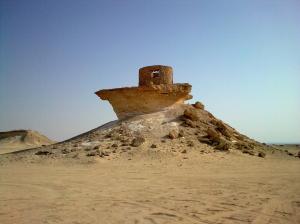 We set off south to Zakreet, where we promptly got lost in the desert, taking a right instead of a left, ended up on the fatal black sand (where it has a potential of turning to sinking sands) and got stuck. We went out, braving the 48 degrees temp and had to push as John vroomed and vroomed. Visions of trying to ring my friend Pat and trying to explain where we were…Em, past the big rock formation then on a bit and there is a huge pack of camels watching us, and I think the sea is over there!!! You can imagine. Then we saw a piece of dried up leathery skin, (maybe of a long dead camel or tourist) so that spurred us on to push harder…and then we got out, and zoomed off and retraced until we found the right rock formation and finally found the mushroom and the old deserted film set, and duly snapped our hot faces. Tasha just wanted to see some wild life, so we called into the abandoned oasis (used for the film) and met a charming Sudanese man who gave us a glass of hot sweet tea. She scrambled up to see the view and disturbed 3 black kittens.