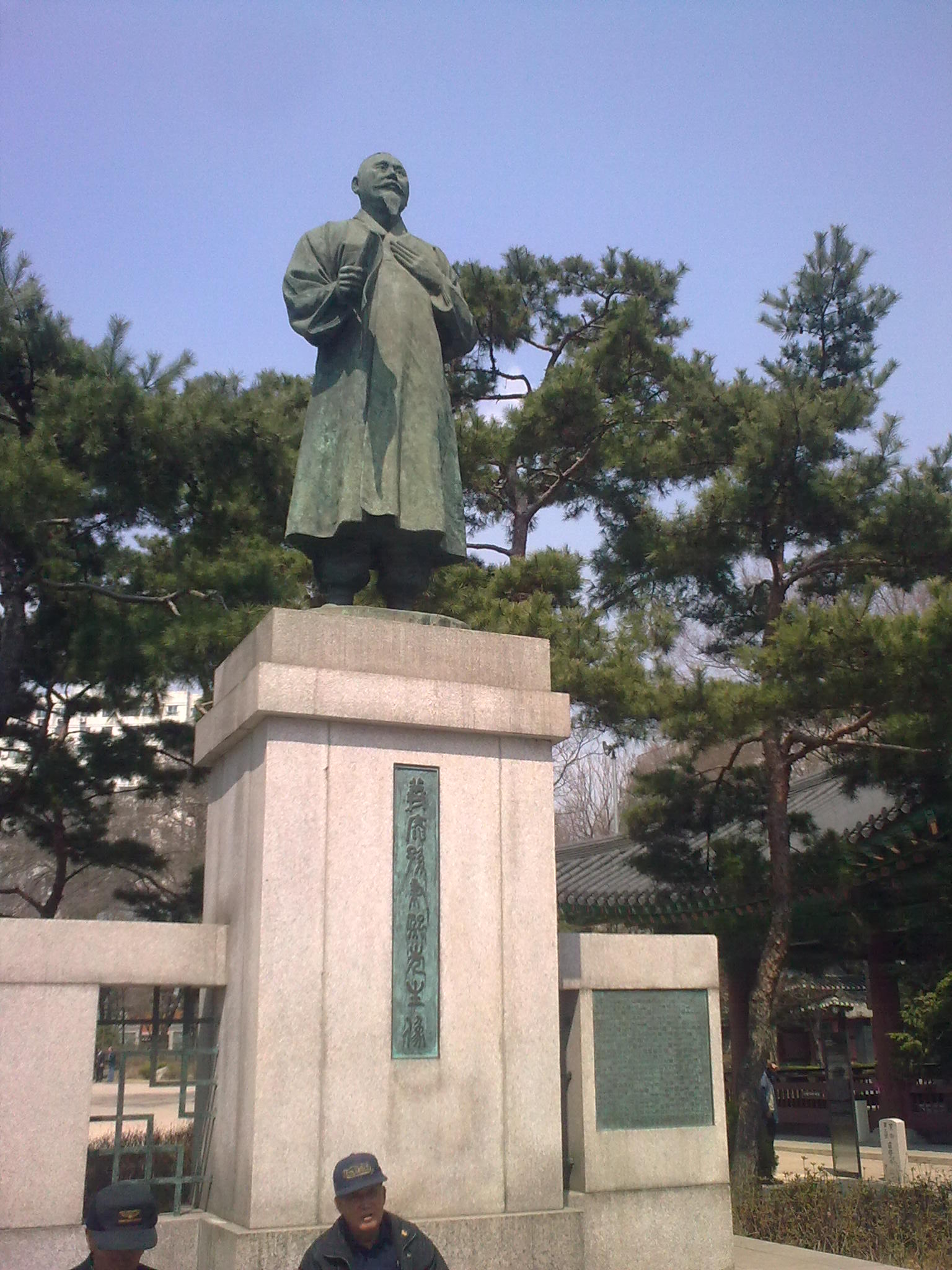 The next day we were very brave and ventured on to the Seoul Metro, and compared to London it was so clean, orderly and efficient… and every time we produced a map, someone stopped and asked if they could help. We cruised around Insa dong, and tentatively went into a park, dominated by a large statue (National Treasure Number 3). I was quite worried as the dusty, wintry park was full of men, sitting enjoying the tentative spring sunshine… (the seasons seem very far behind the UK… there wasn’t even a bud on a tree). Oh well, we were made to feel quite welcome.