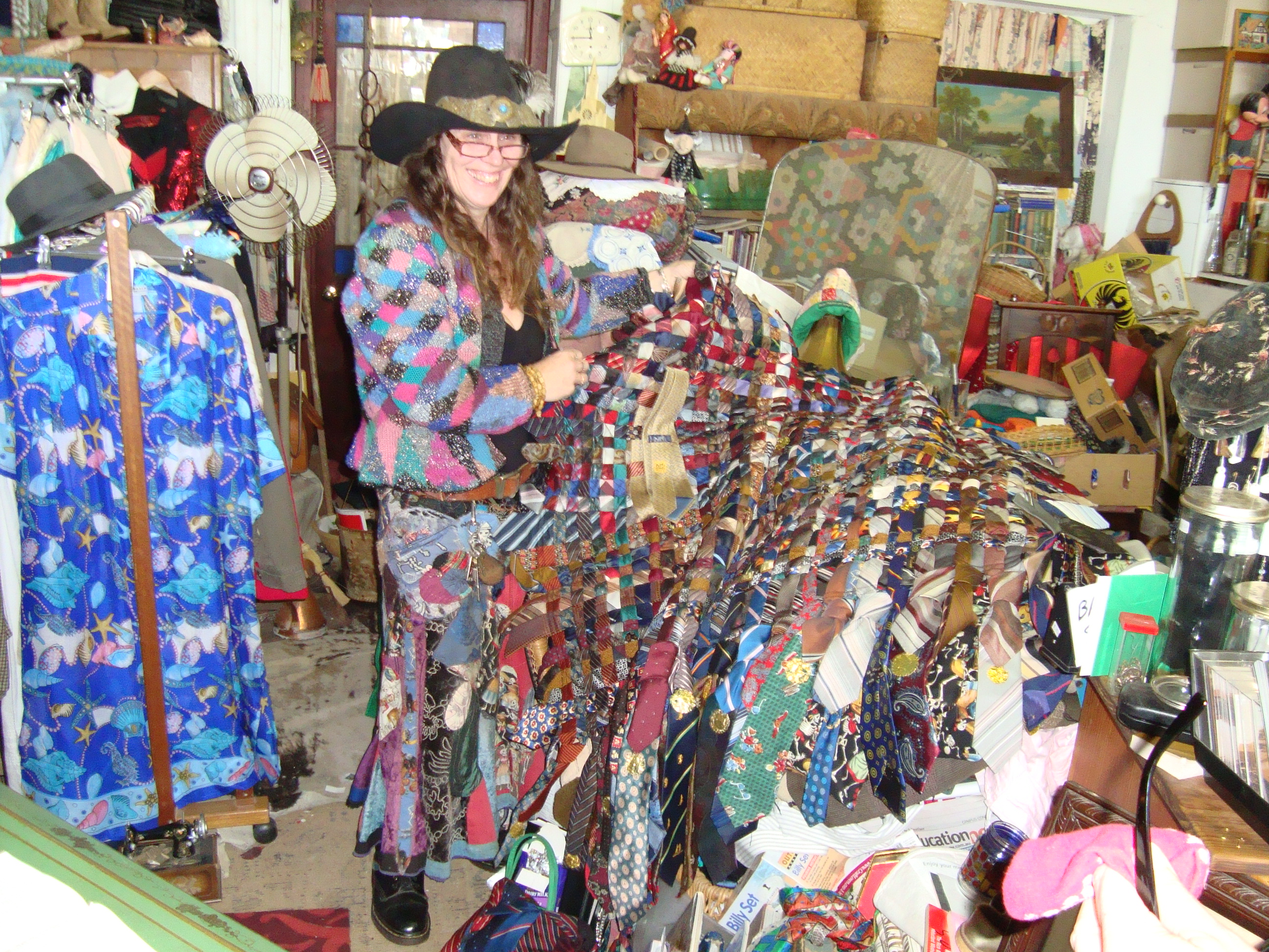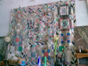 What can I say…she got under my skin. She was outrageous. Clad in a patchwork skirt, with crazy patchwork sweater, she showed us her quilt made up of ties, and her other quilts hung on the walls, mementoes of cold winters in the Barossa and Germein where there is nothing else to do. She and her husband are true hippies; warm, funny, true free spirits, and so talented. I noticed on the baby grande piano that she used as her shop counter, was the Bible opened at Corinthians.