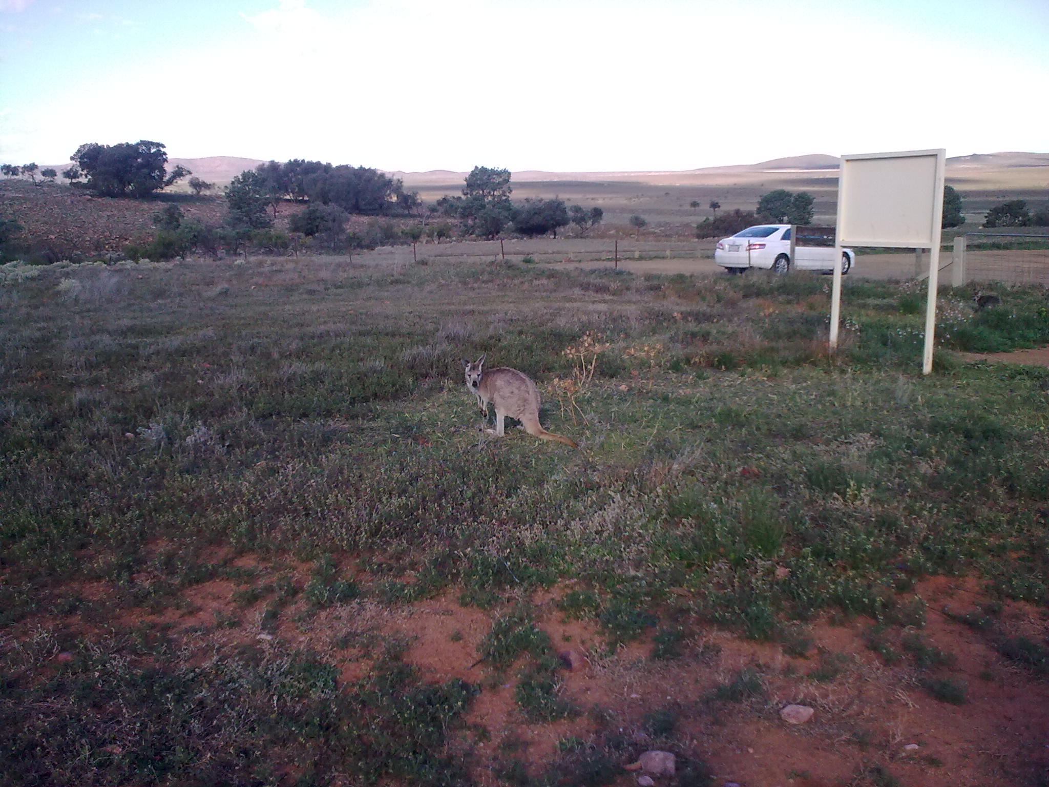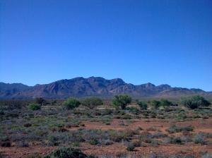 I am still reeling from our road trip at the weekend for at last I feel I have seen the real Australia. Not the esplanades, malls and city sights, but the vast areas of mallee or scrub land, with eucalyptus trees looking as though they have been there since the Beginning. When I tried to gather my thoughts the first evening, lying in a cabin up in a national park in the Flinders Ranges, I could only think of the stars. We drank some red wine and sat and looked and it was as though the sky would not hold them up, there were so many millions. In the morning I looked out of the window and there were two wallabies sitting under a gum tree, and behind them was the sharp outline of the rocky Flinders with the sun just rising.
