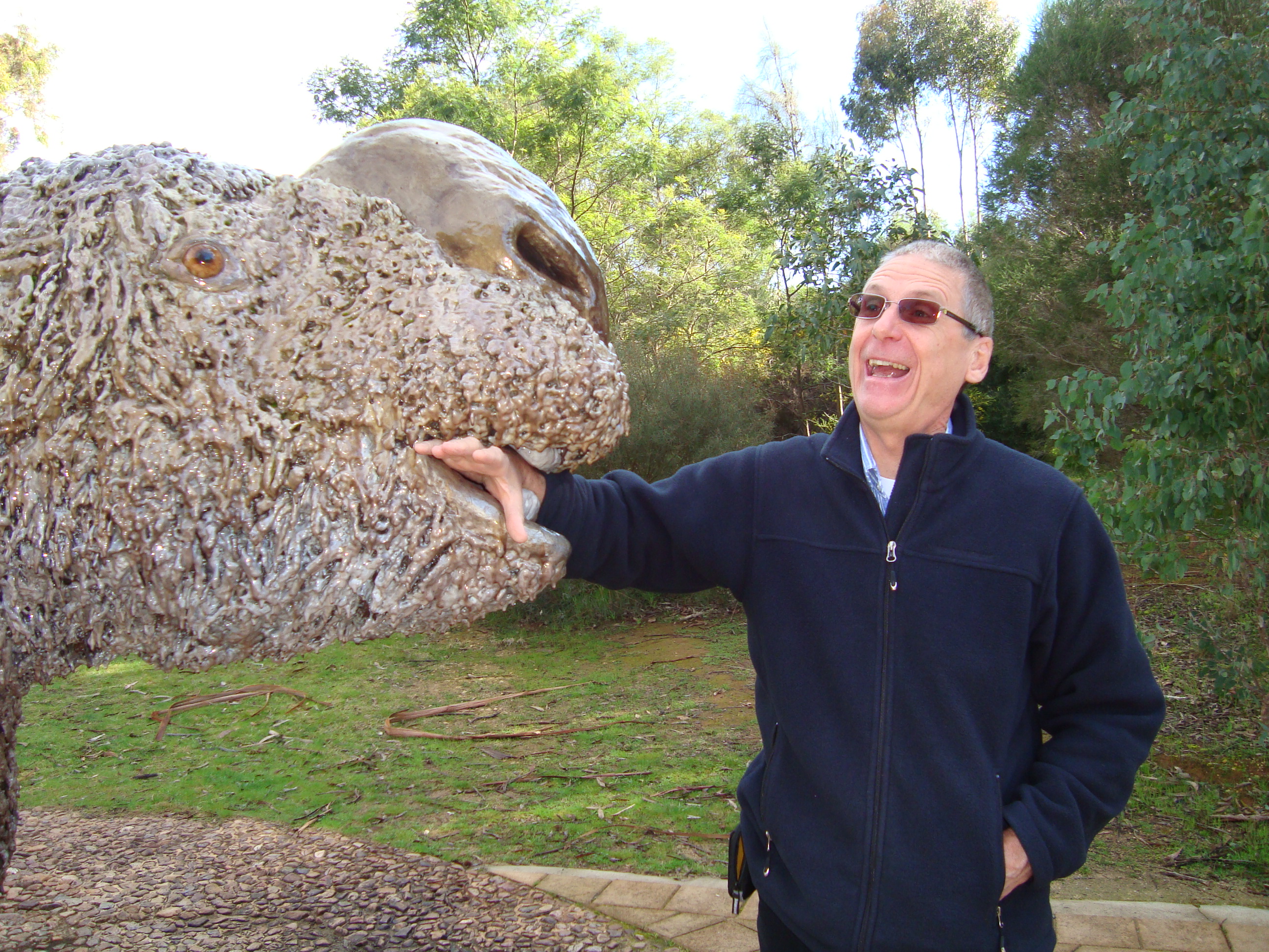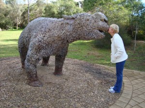 The Highlight of the trip were the Naracoorte Caves. Just when I thought I knew everything, suddenly a trip down under the ground into limestone palaces of incredible beauty changed all that. We were confronted with a fossil bed, the size of an Olympic swimming pool, full of bones of creatures that had fallen down holes and died 500,000 years ago. Palaeontologists had constructed models from the bones they found of the ‘megafauna’ creatures that are now extinct…marsupial lions, and leaf eating kangaroos, and snakes of 6m in length. They think they died out about 50,000 yrs ago.