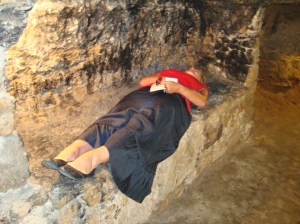 Nowadays it is used as an archaeological museum, with some very amazing pots and pans dating back to the 11th C BC. We climbed down into the tomb, and I lay down on the hard rock carved into the cave. I felt a little like Juliette. It was actually quite creepy.