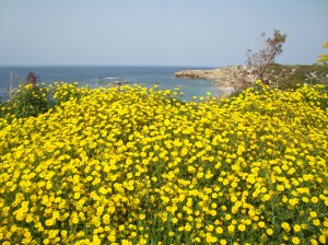 Yesterday we drove up the panhandle of the Karpaz Peninsula. It was all very beautiful, the countryside verdant and dotted with tall yellow flowers and carpets of dog roses, cyclamen and anemones.