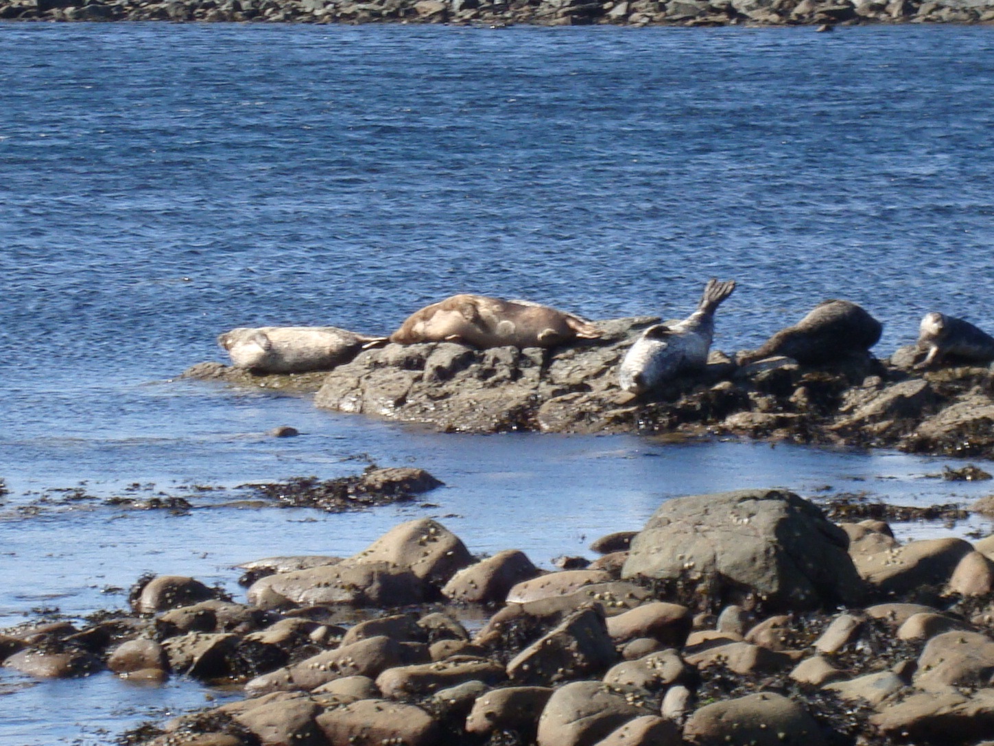 Anyway, the wind blew, the clouds scurried in black and grey puffs, and the guests were treated to a magical mystery bus tour on the way to the church, passing exquisitely dramatic scenery, but NO trees. There were miles of dry stone diking, neat and tidy crofts, sheep everywhere, and this wide flat land that ran down to the inevitable sea. We saw fat seals sunbathing on the rocks just down from Tescos. They weren’t in the least bit shy, and just waved their flippers at passers-by.