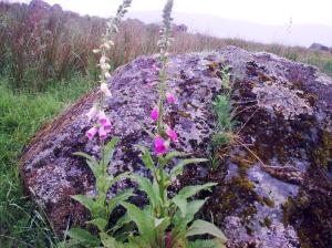 We duly posed for the picture, then with a triumphant sigh we headed off down again. This was nice – passing blueberries, foxgloves and wild wild heathers.