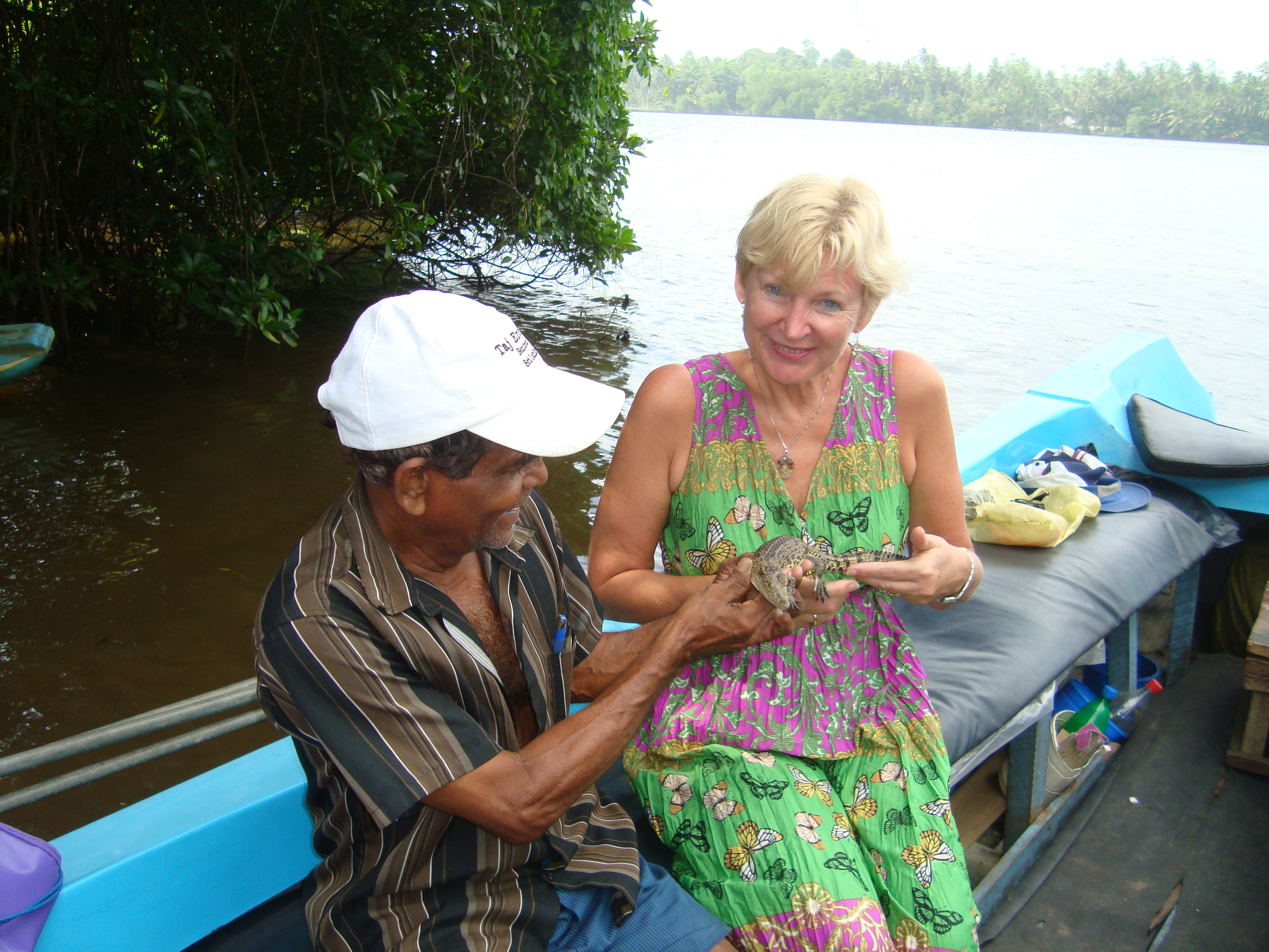 Ranjith organised for us to have a boat trip on the Bentota River. We went with ‘Fred’ and he took us through the mangrove swamps, where Crocodile Dundee, Indiana Jones, and The Bridge over the River Kwai were filmed. We saw a crocodile and John played with a baby one, whilst in the background a huge monitor lizard marched past from the long grasses behind the boat. I obligingly stroked the little croc’s tail, but wasn’t tempted to have it cavort about on my head. Leave that to the eejits I say.