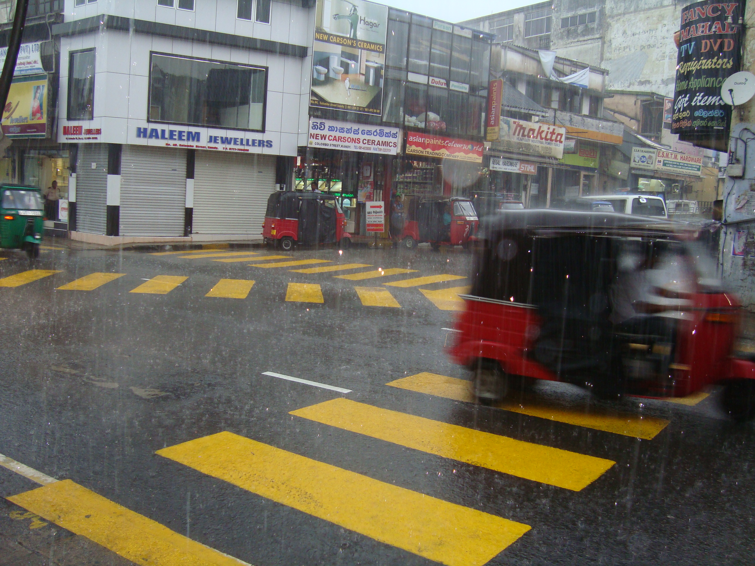 Then the real reality of Kandy hit us…the urban sprawl, the con artists, and the hassle. We spent a good hour in the doorway of a shop as the monsoon lashed down its fury in forked lightening and blood curdling thunder. It was actually wonderfully exciting. We watched people dash about with gay umbrellas, soaked from the knee downwards.