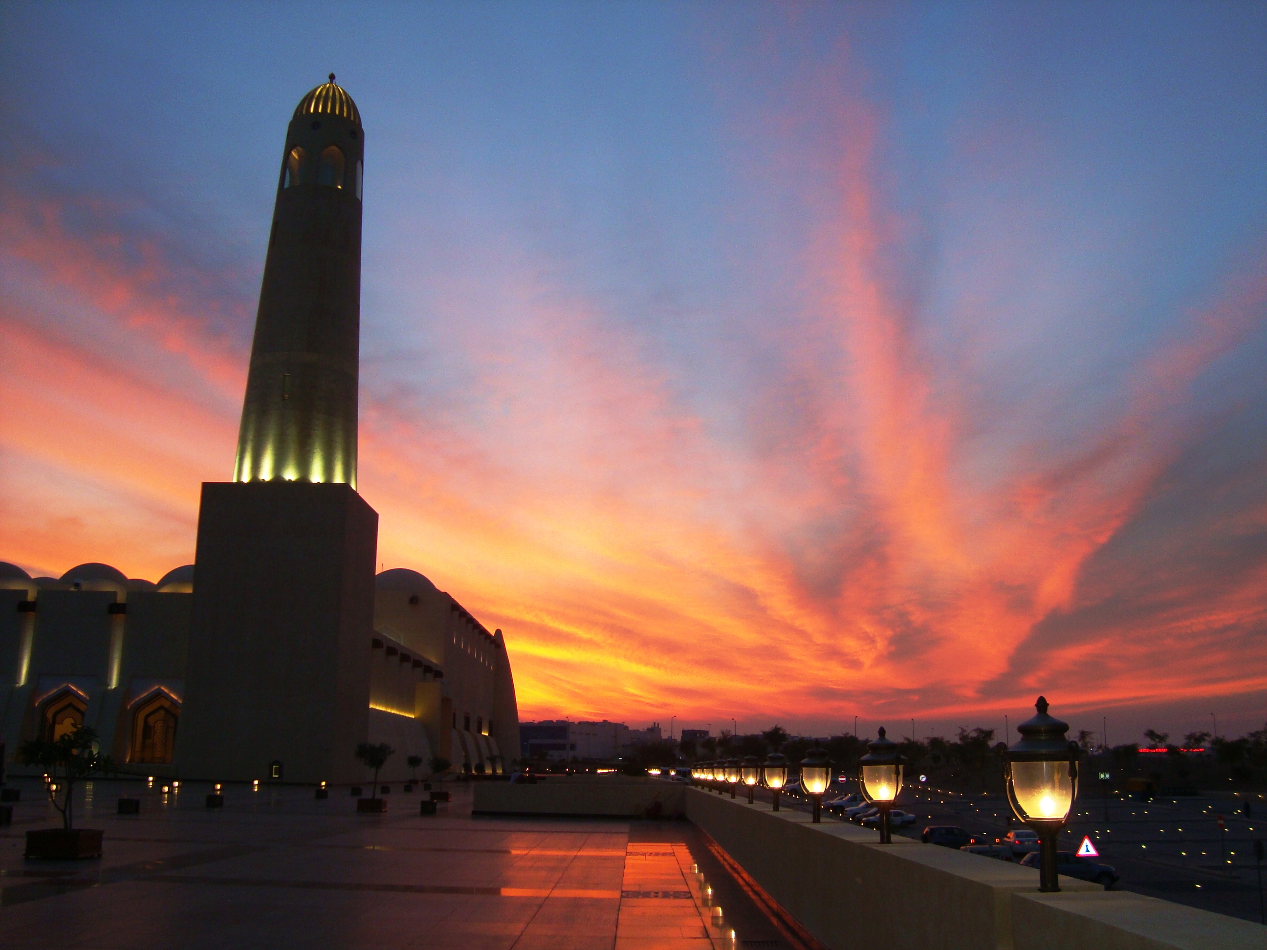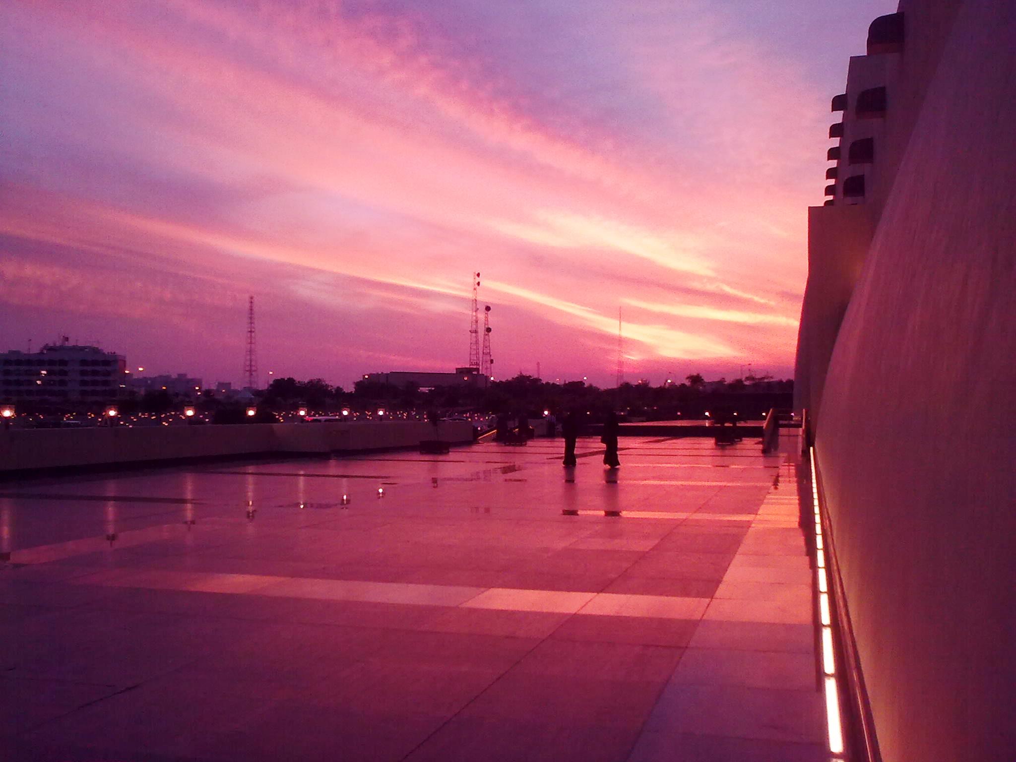 John and I did decide to be tourists for once. The state mosque tour was interesting…led by a born again muslim called Dominic from Luton. He had a long straggly beard, elfin ears and a too short dish dash. But he was funny and entertaining and we were there for the evening prayer which was interesting. The ladies were ushered upstairs and were hidden behind the wooden lattice. It was quite nice and actually quite peaceful. Outside the sky was on fire.