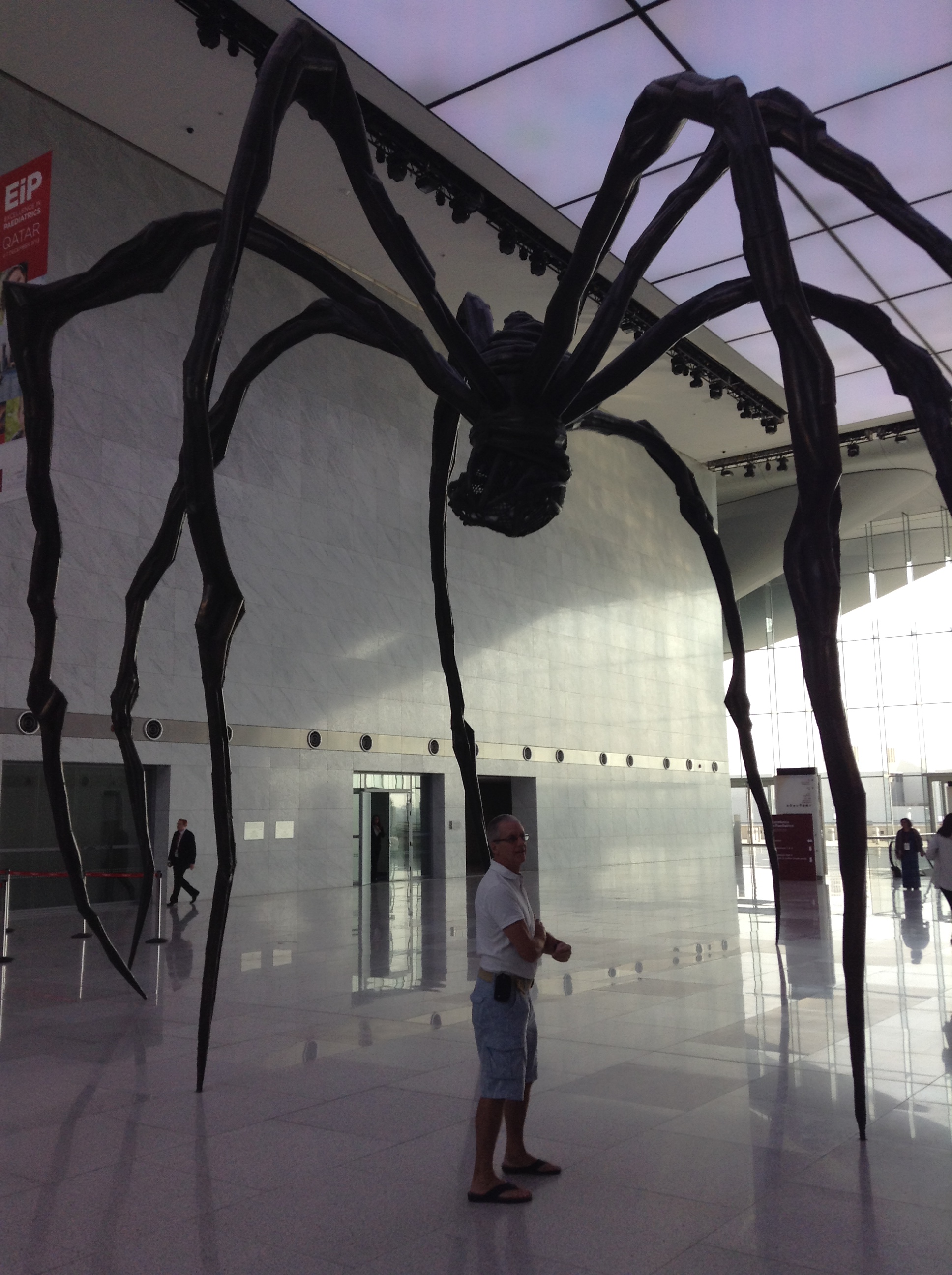 Louise Bourgeois likened the spider with metaphors of spinning and weaving and nurturing and protection. Her own mother was a weaver and she also repaired tapestries, before sadly dying far too young. Louise created this huge spider, 30ft height and 33ft wide with 26 marble eggs in the egg sac. The original is in the Tate Modern in London, and the other permanent fixtures are in Canada, Bilboa, Japan, South Korea and here in the Conference Centre in Doha. It was quite amazing.