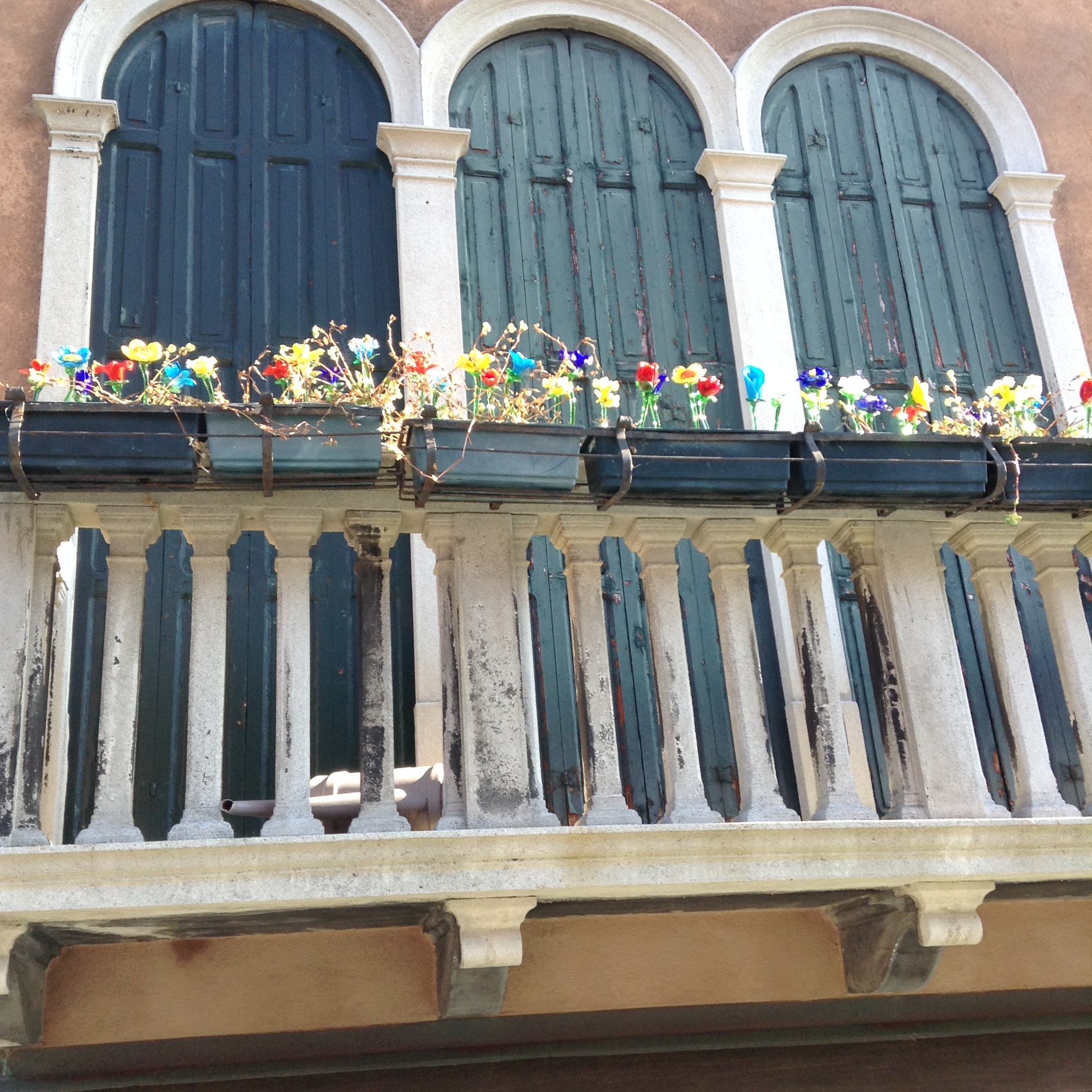 We took a vaporetto to Murano. What a wonderful surprise. I sort of expected a furnace, a display of glass blowing and a factory outlet (which we did see) but the town itself was like a miniature, sunny Venice, and we ate spaghetti vongoli and drank Prosecco and wandered about, and bought some glass balloons. I took a picture of a flower box complete with a glass garden!