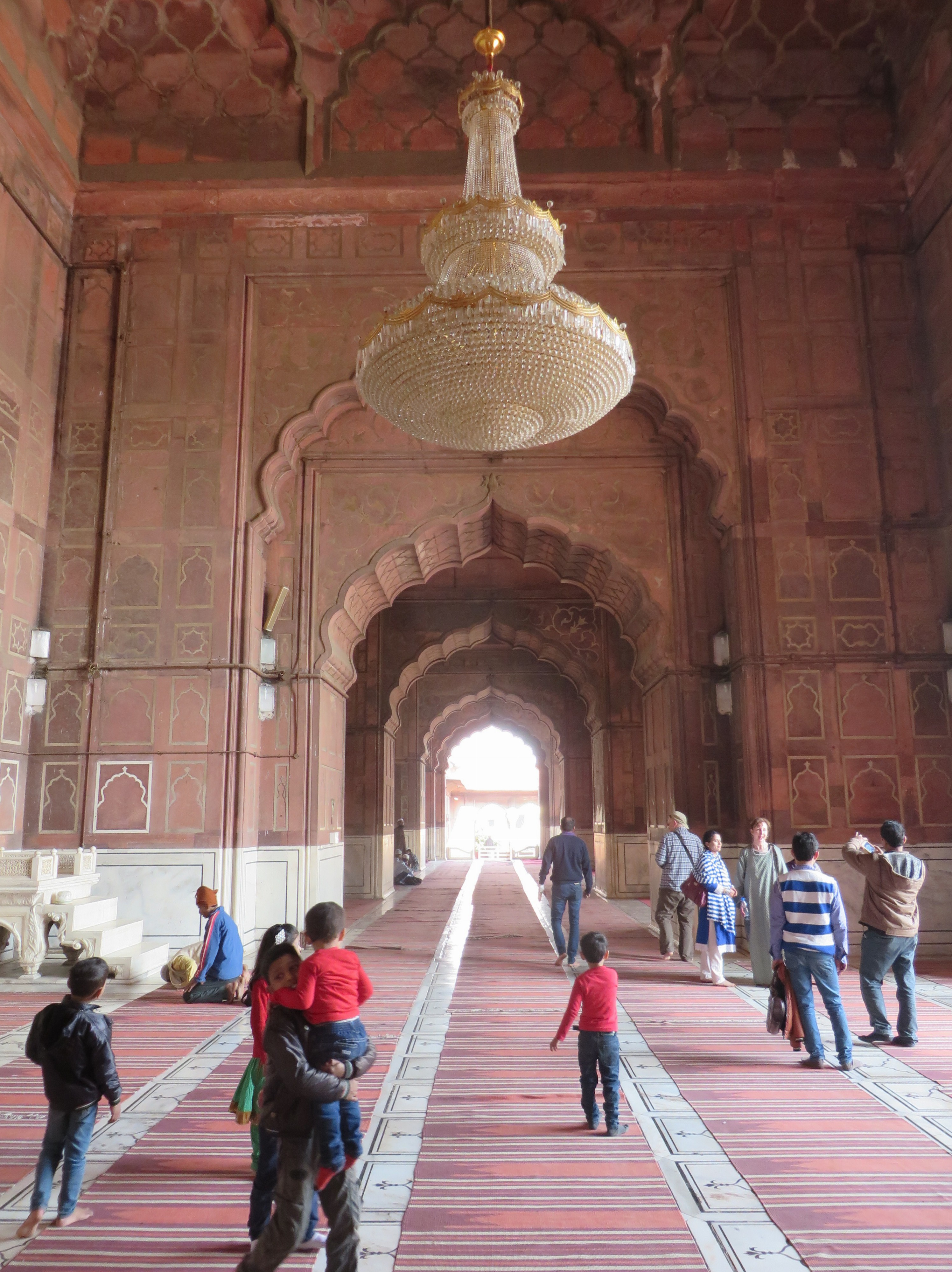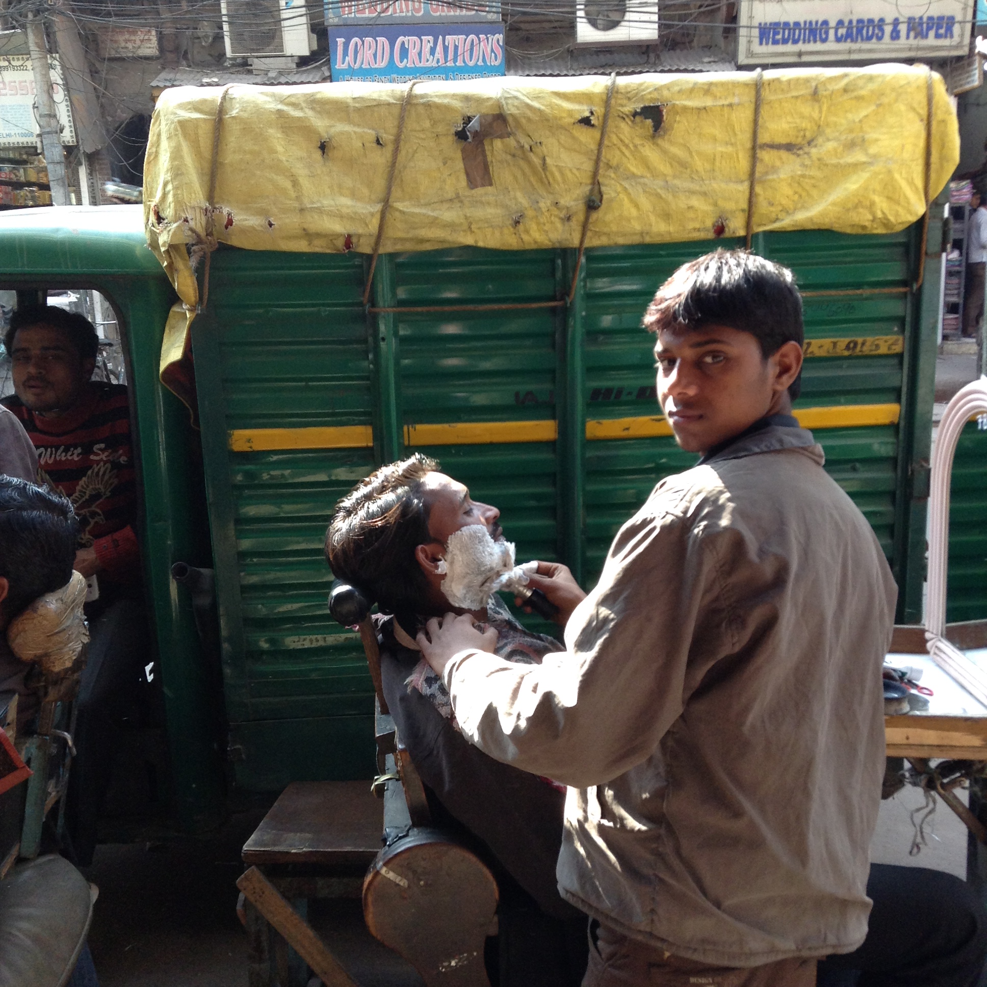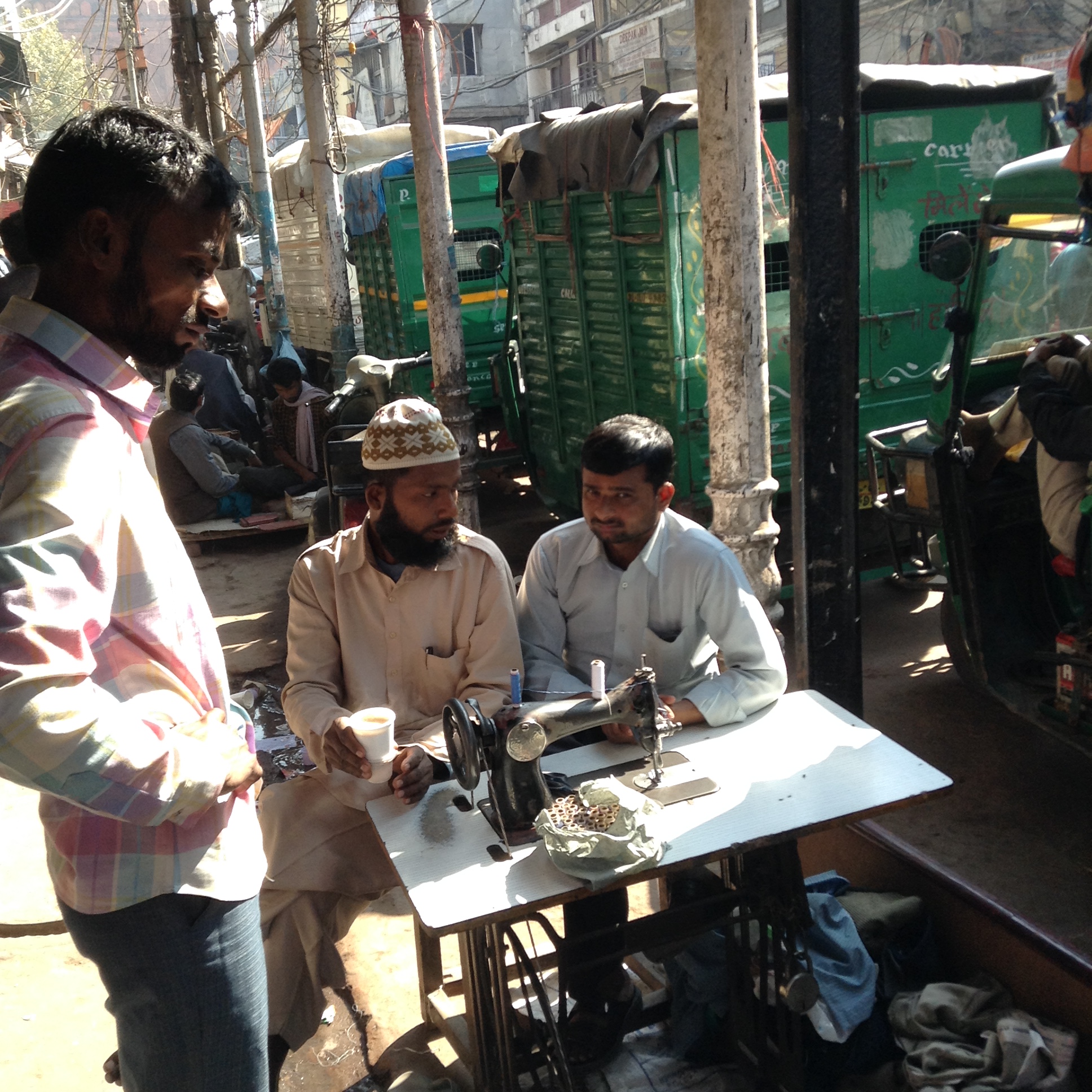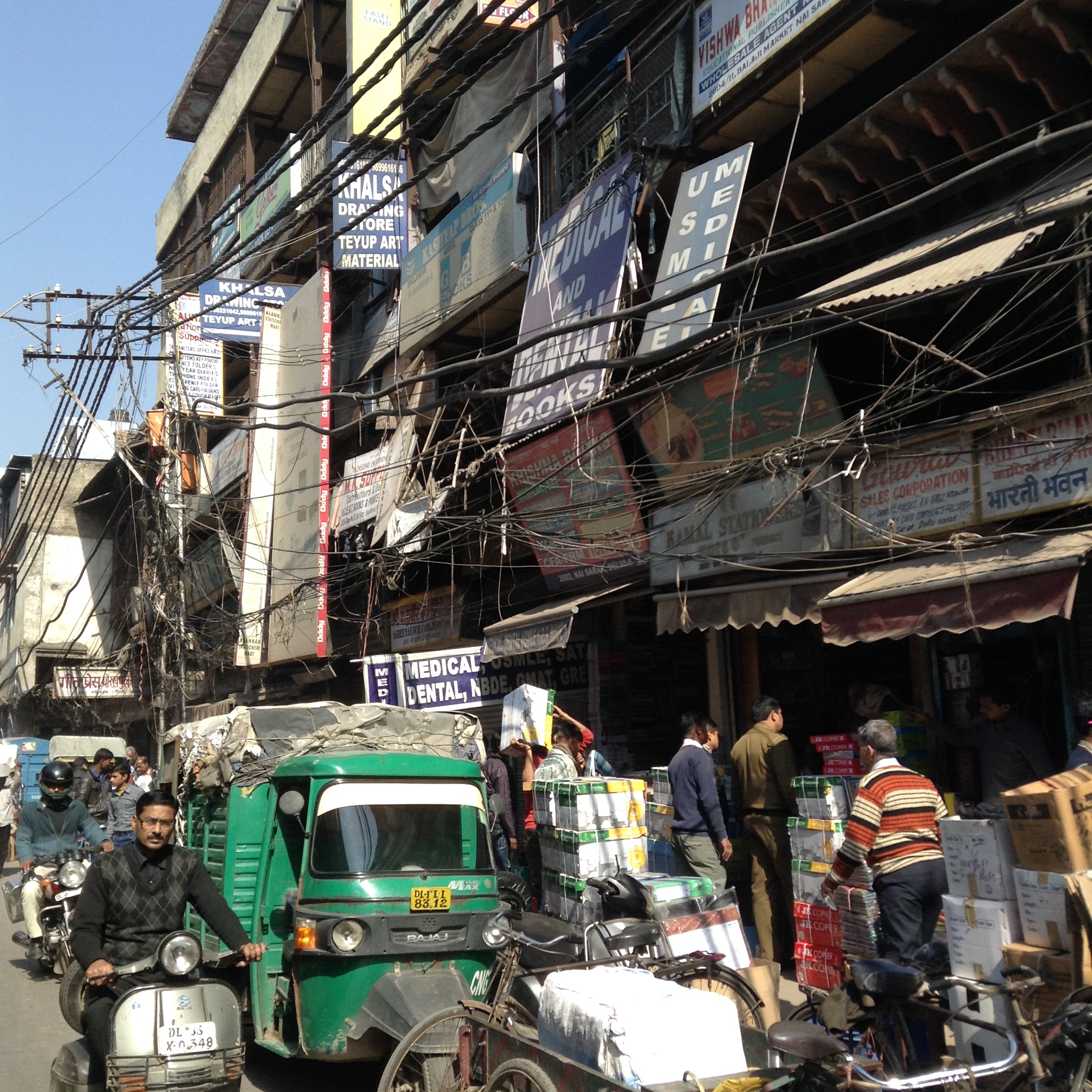 We were on our way to visit the mosque built by Shah Jahan (of Taj Mahal fame) and so we marched through the vibrant chaos of the bustling Chandi Chowk Bazaar along the bathroom/plumbing street, then the wedding invitation street. There were tailors, barbers, chai sellers all busy about their business on the pavements beneath the spaghetti madness of overhead electricity wires. How do they take meter readings? How do they find the right wire if there is a fault?