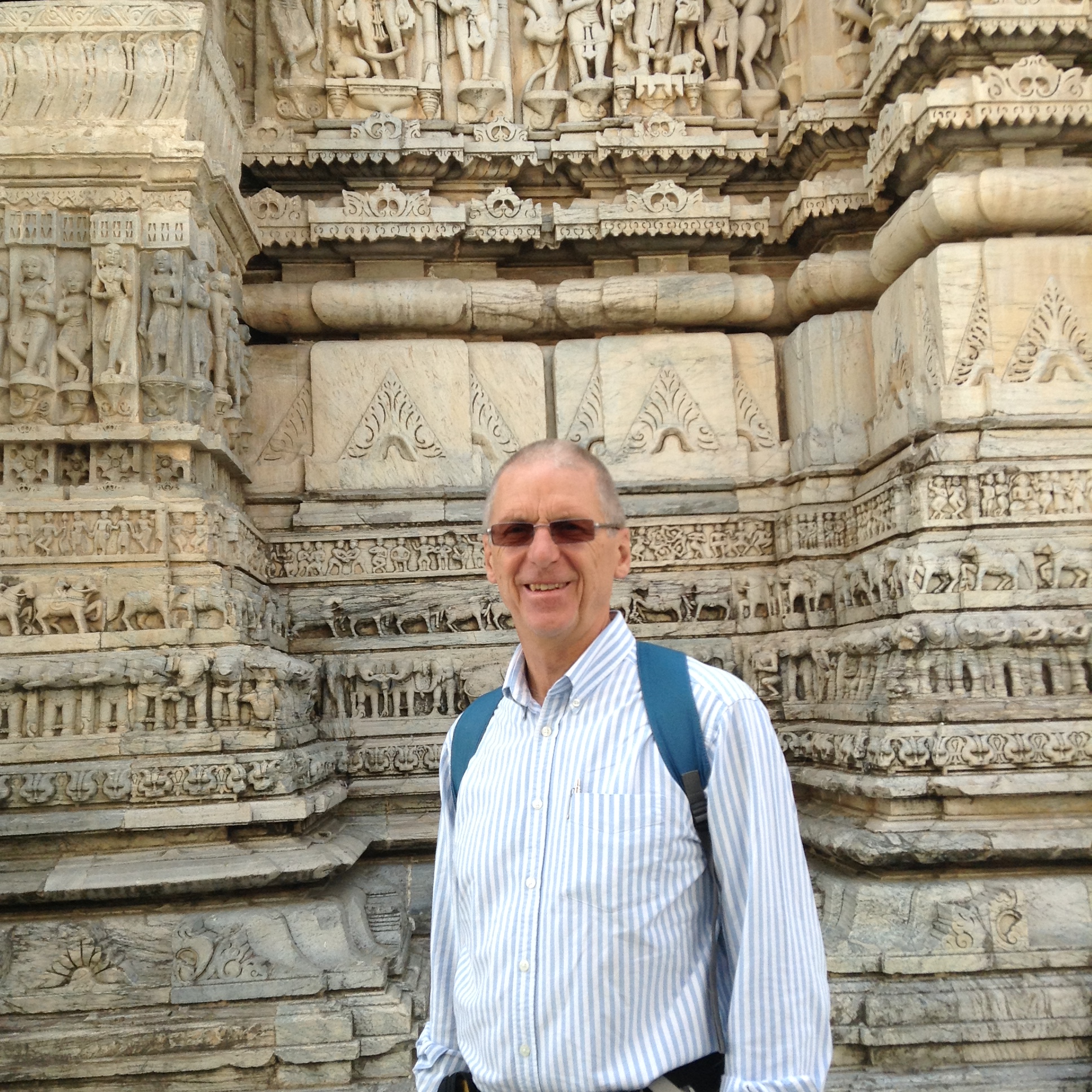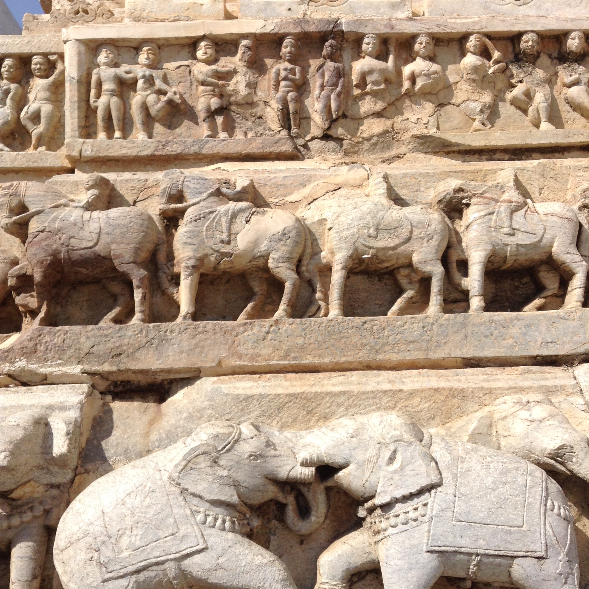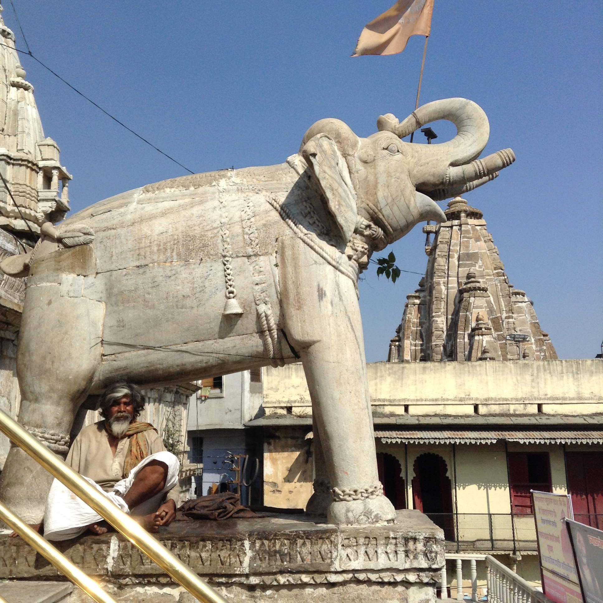 We admired the intricate carvings of the Jagdish Temple – home to a black stone image of Vishnu, but he was out of sight under a checked table cloth, sleeping apparently. Instead I took a picture of the elephant that was guarding the temple with a very cool guy sitting underneath.