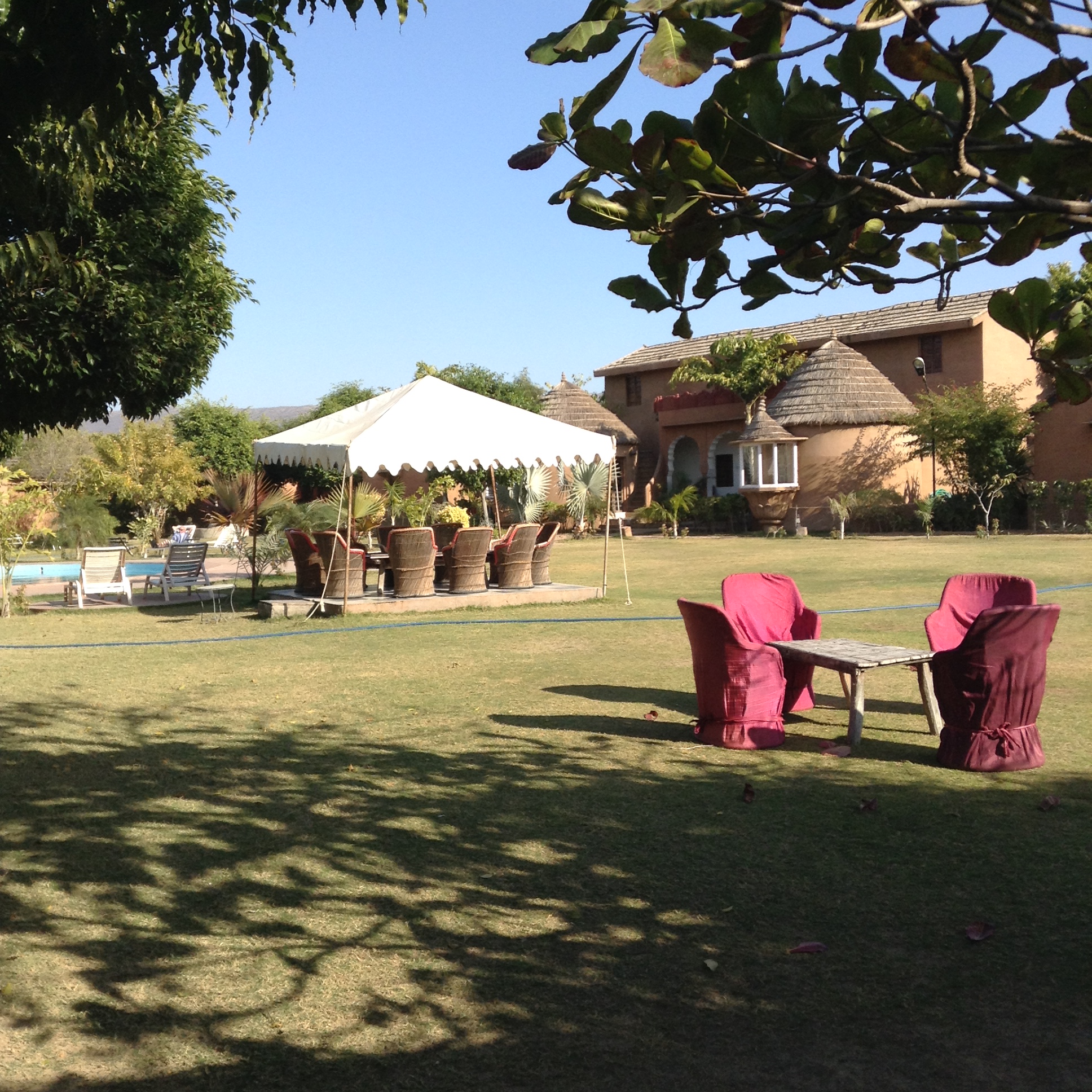 But here we are today, in this serene Pushkar Fort Hotel, set in 10 acres of grass with sprinklers, and a family of geese with their goslings looking very tranquil. It is wonderful to have a respite from the noise and confusion until 4 p.m. when our camel excursion begins.
