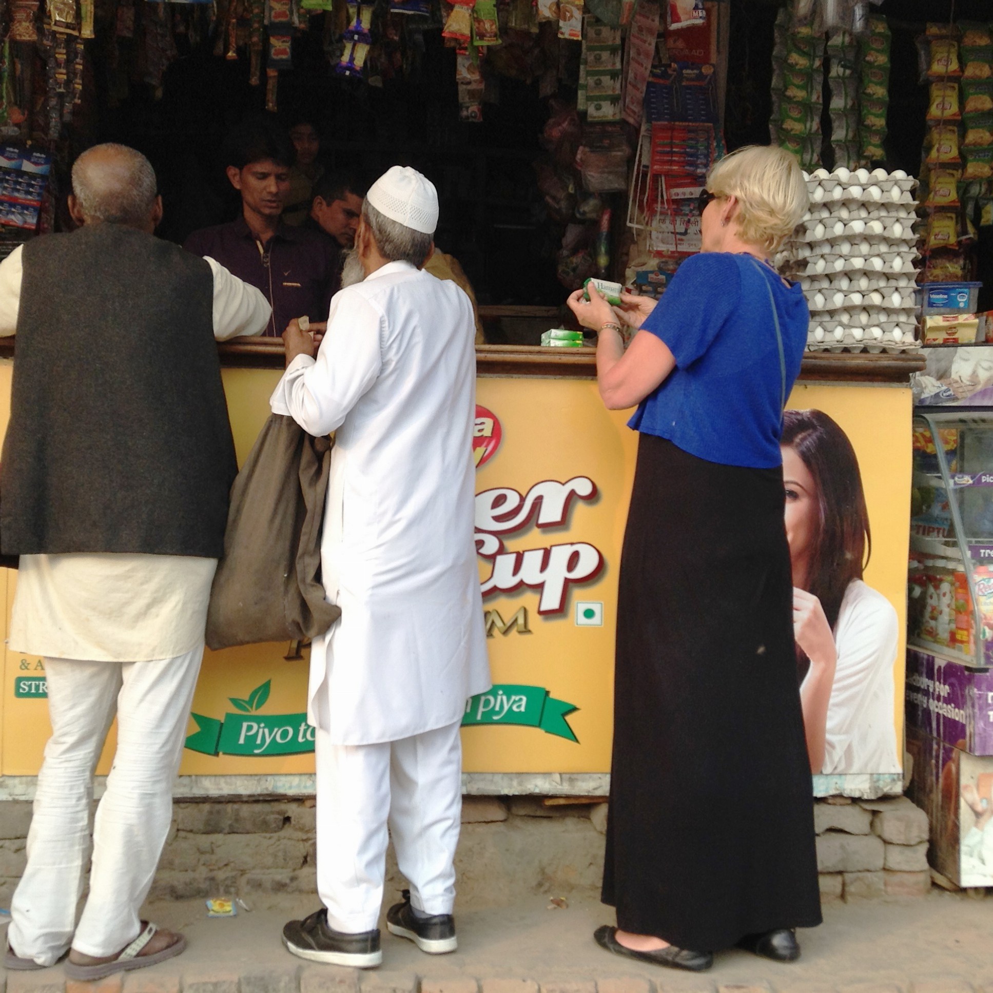 Fortunately this came from Gerald, an elderly sheep farmer from the Yorkshire Dales, who had gone out for a pint on his own. Wandering back to the hotel he was beguiled into a shop and came out clad in a purple salwa kameez and a baby pink silk scarf. His wife said nothing, but we all laughed and laughed. I think Gerald might have rather liked his new clothes! He retired rather sheepishly and packed his new booty away.