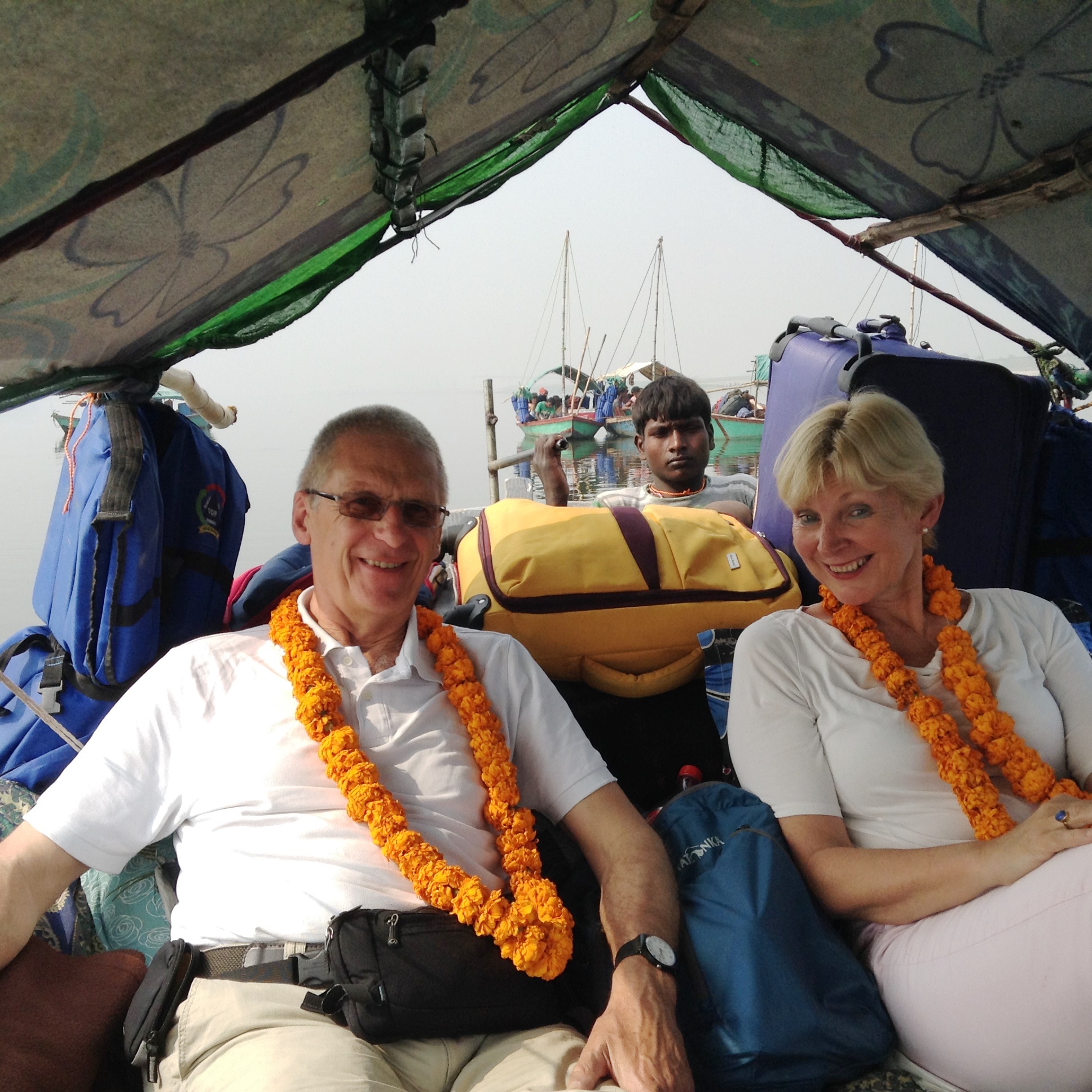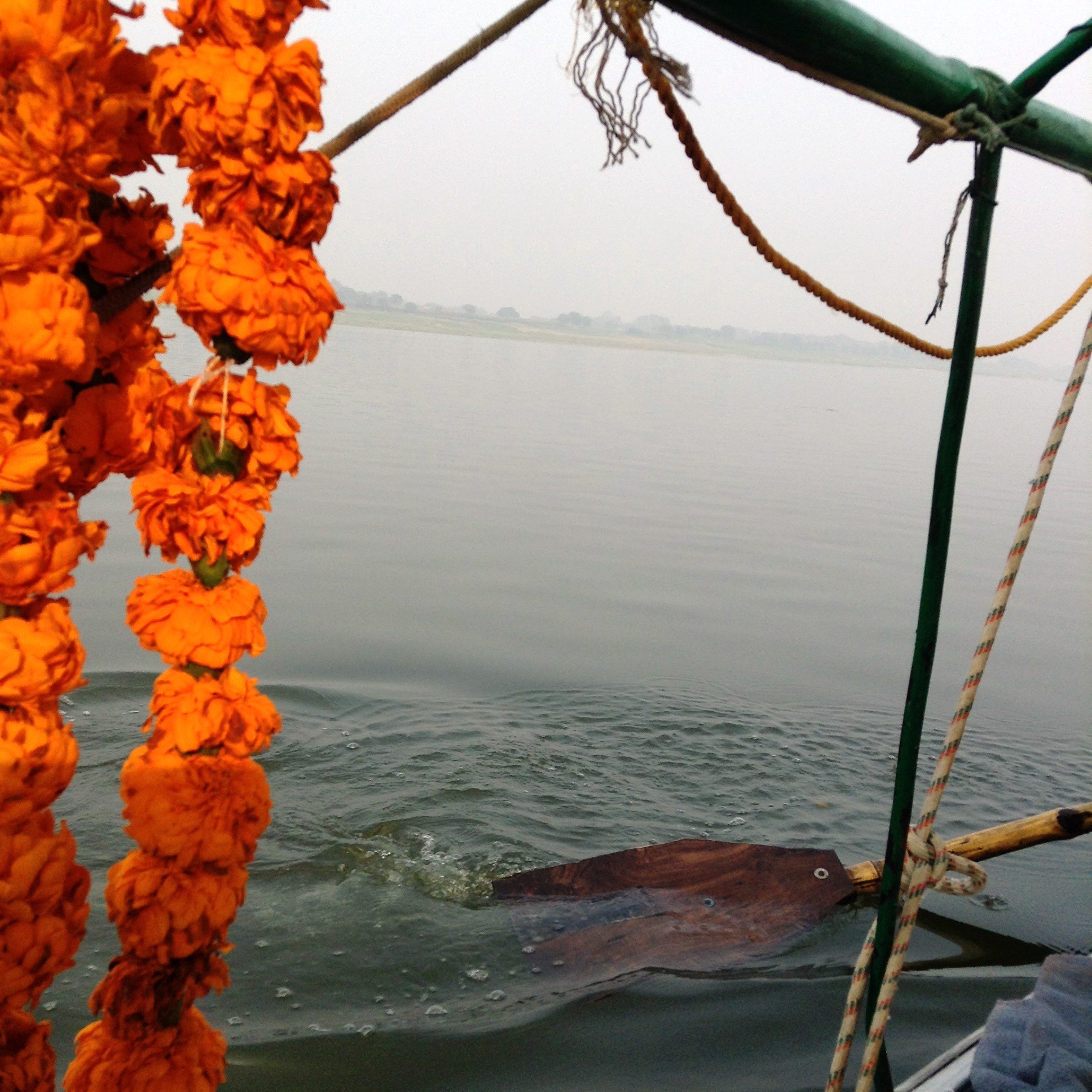 We were loaded on to small traditional crafts, (4 of us to a boat), given bright orange garlands, and we lay back on cushions as two stringy youths with hard muscles rowed us down the river for six hours.