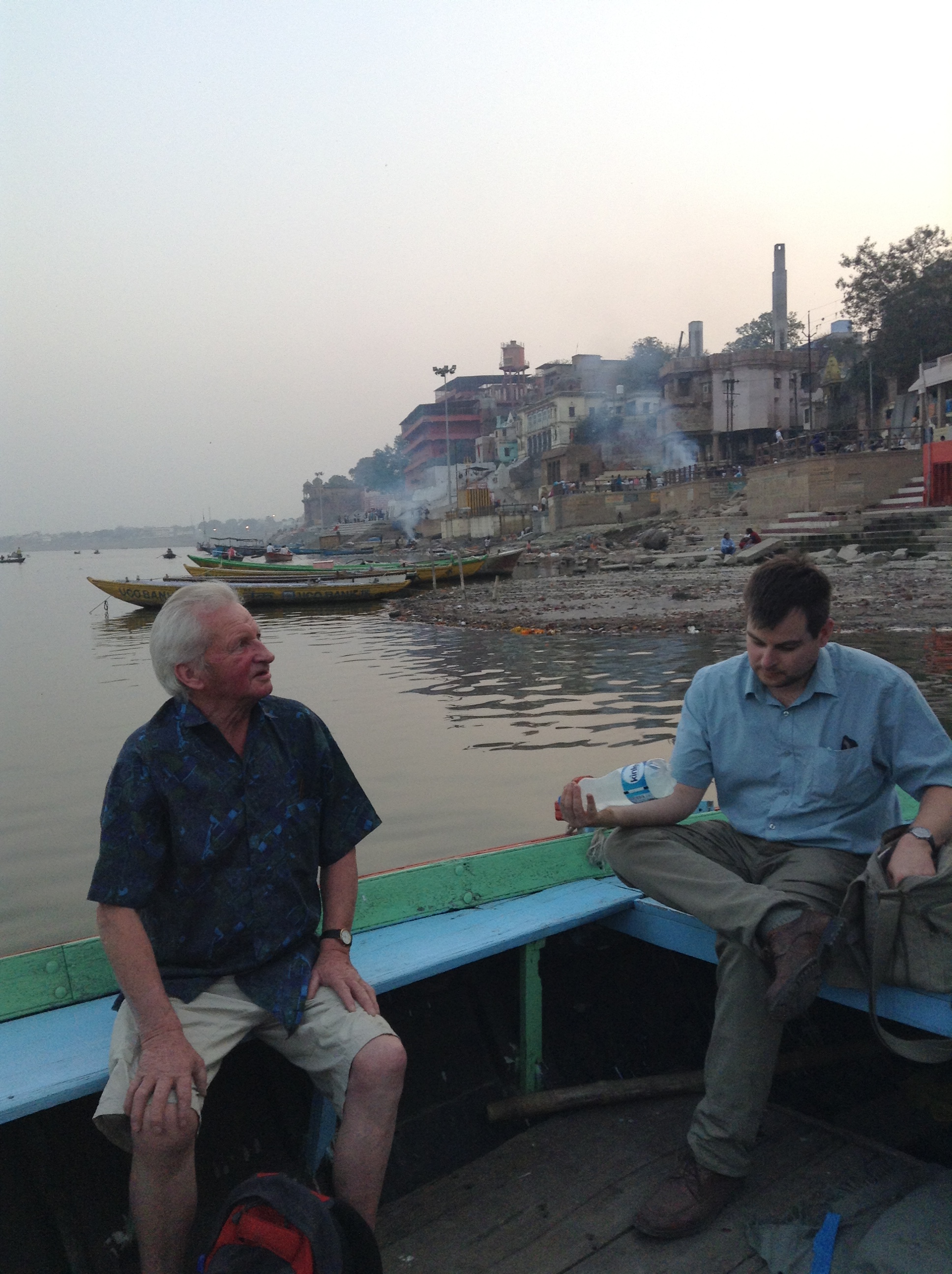 It was bright, musical and noisy and is performed 365 days of the year. Along from the ghat where the gongs and banging and the chanting is going on, the funeral pyres burn incessantly. We sailed along to have a closer look and we saw several bodies laid up waiting to be cremated.