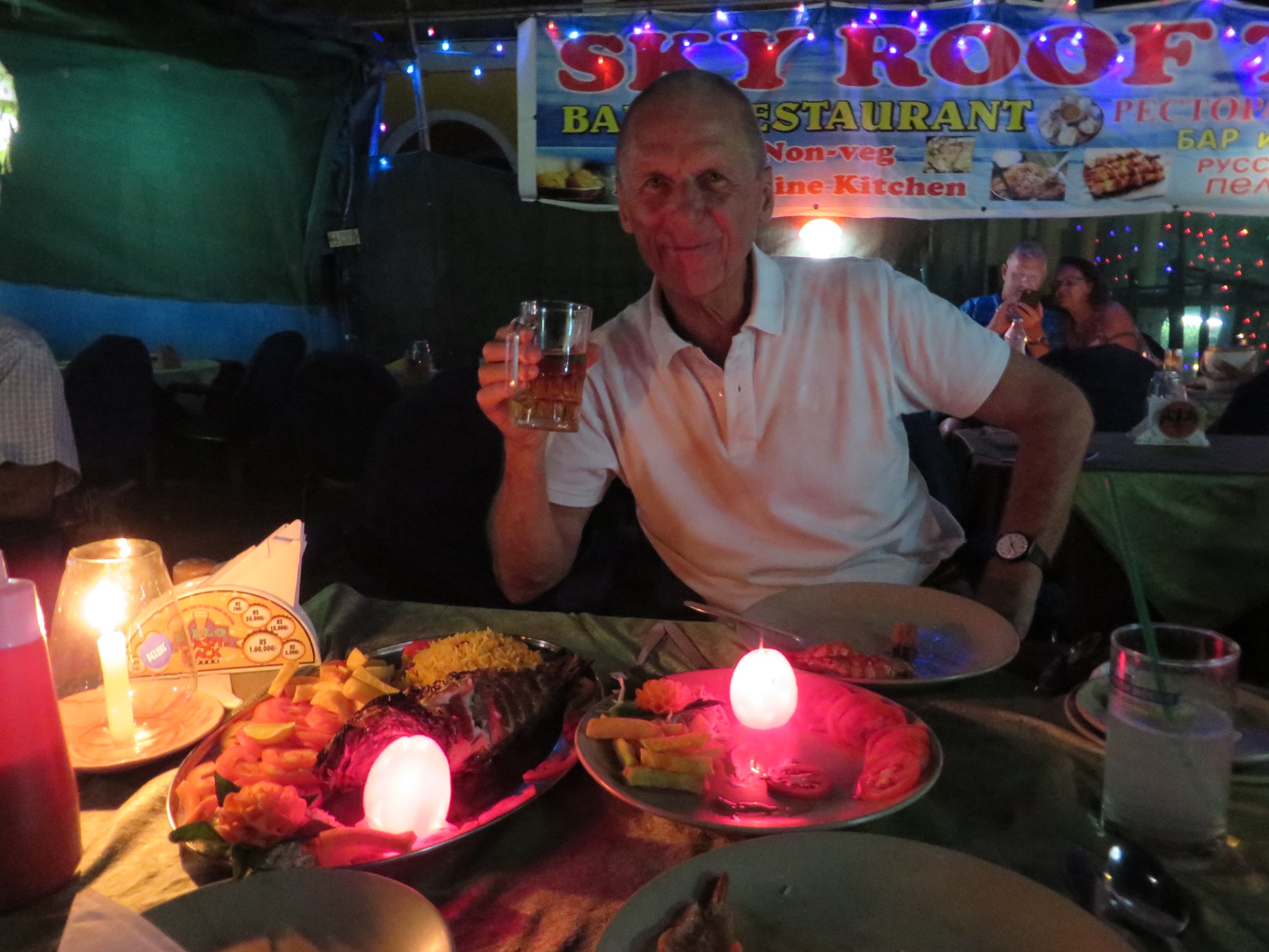 Last night was the full moon, and we sat in our favourite little food shack on the beach, watching the sun set and drinking Honeybee brandy and eating the most delicious vegetable curries.