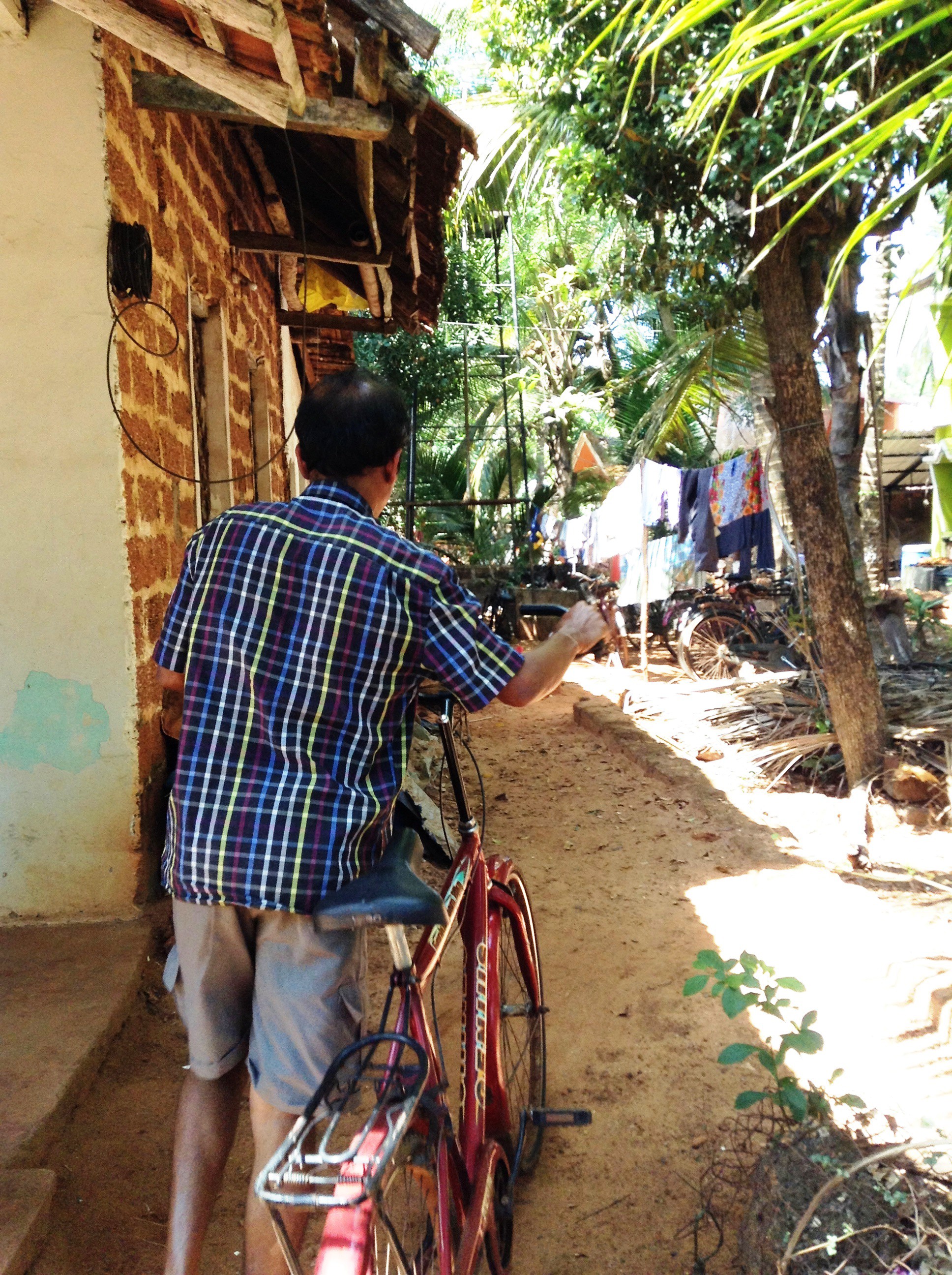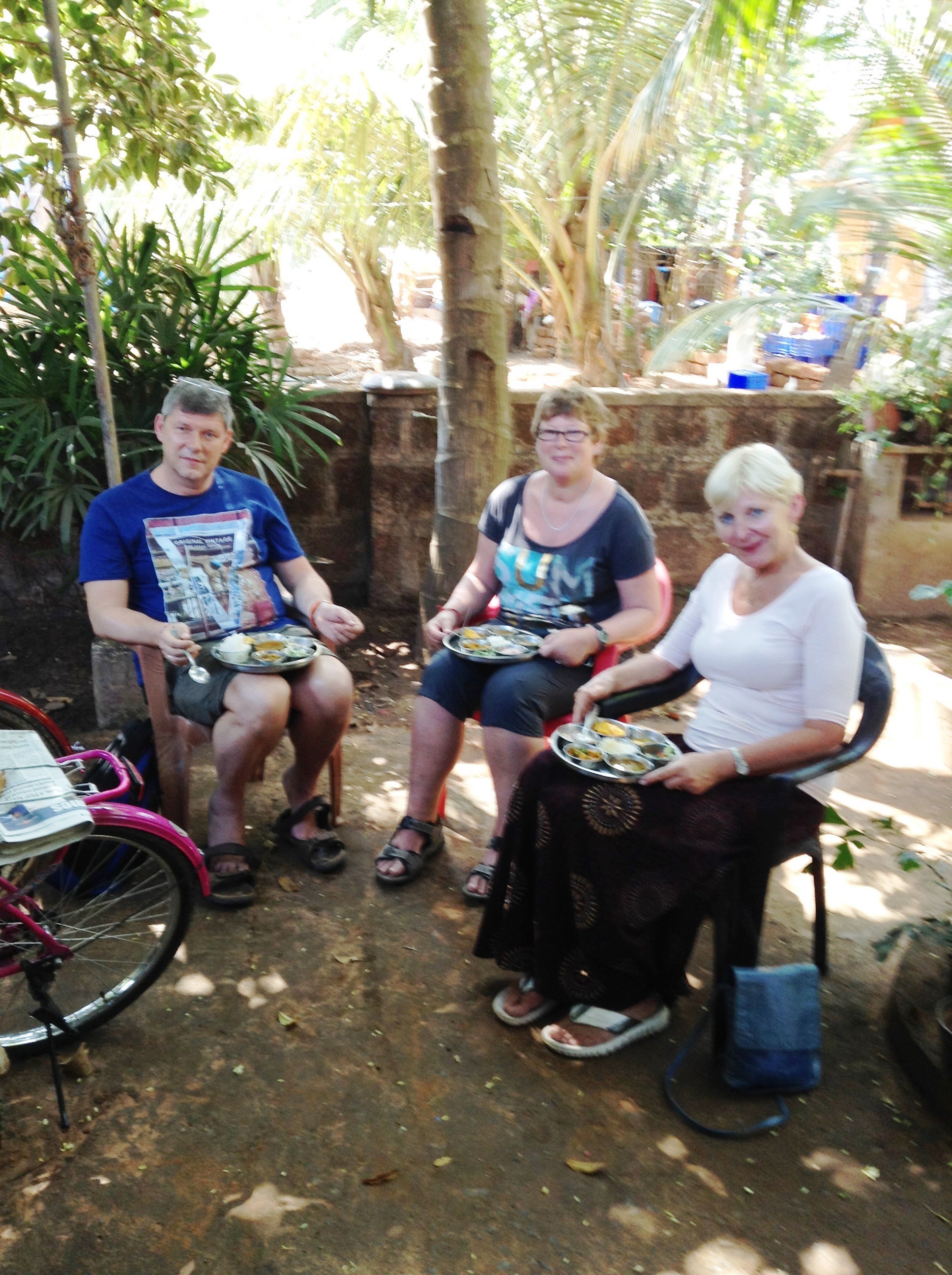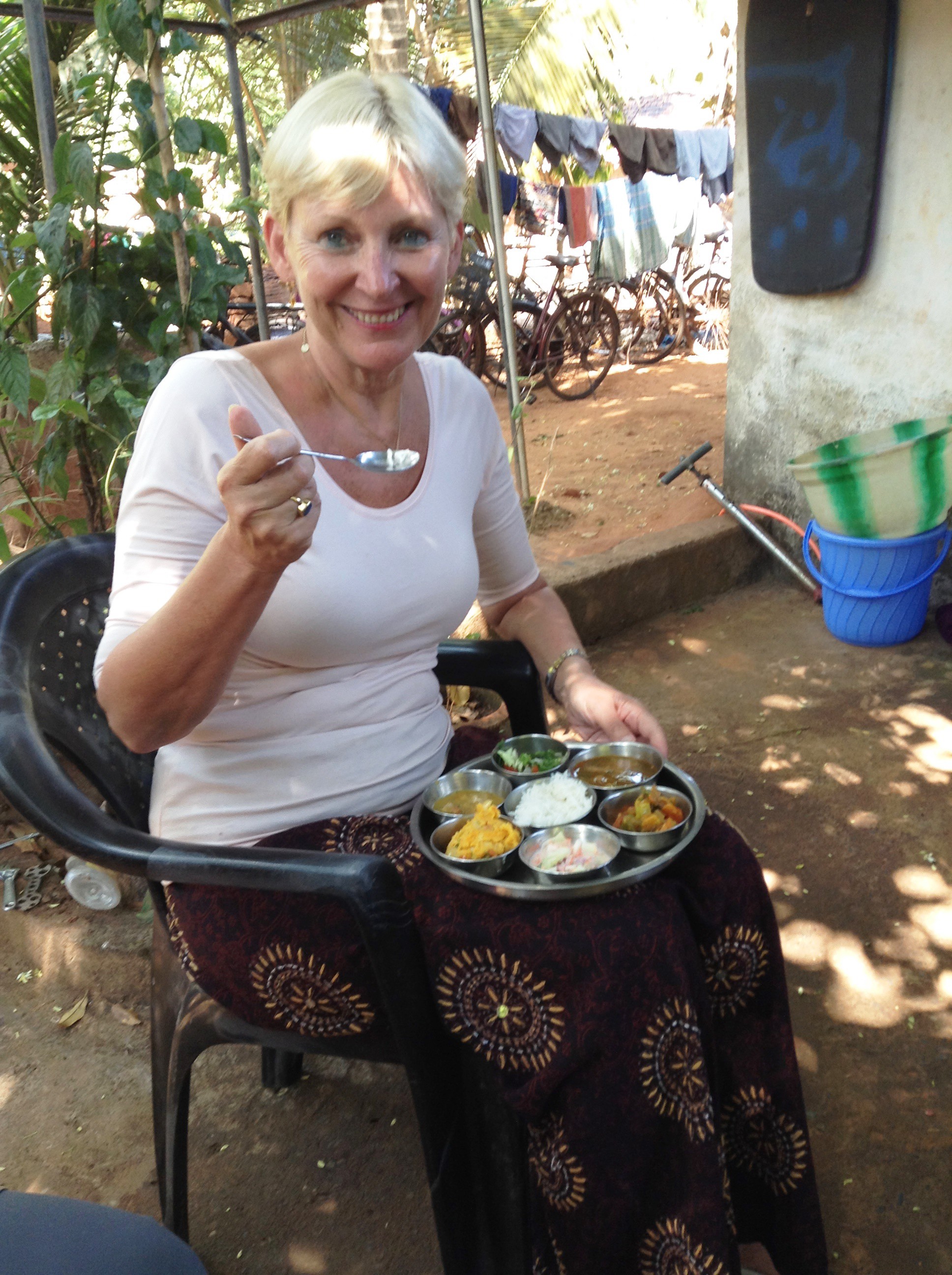 The kitchen was tiny, but everything had its place. For 600 rupees, we learnt how to make masala curry, dahls, baajies (not the same as onion baajies), and later he served it all up ‘thali’ style to us under the trees with the old bikes and chickens, and his large family ate the rest inside! The German man was very kind, and whilst Shiva was inside he surreptitiously produced a water bottle full of proper Austrian brandy (not Honeybee) and urged me to have a sip. I did – and shuddered, rather like the girl I once was behind the bike sheds at school long ago, sipping some forbidden alcohol spirited away by a day girl! Anyway the German couple assured me it would prevent any bugs doing mischief in our tummies! Then he urged me to have another sip. I declined. Any more and I might have launched into my repertoire of ‘The Sound of Music’.