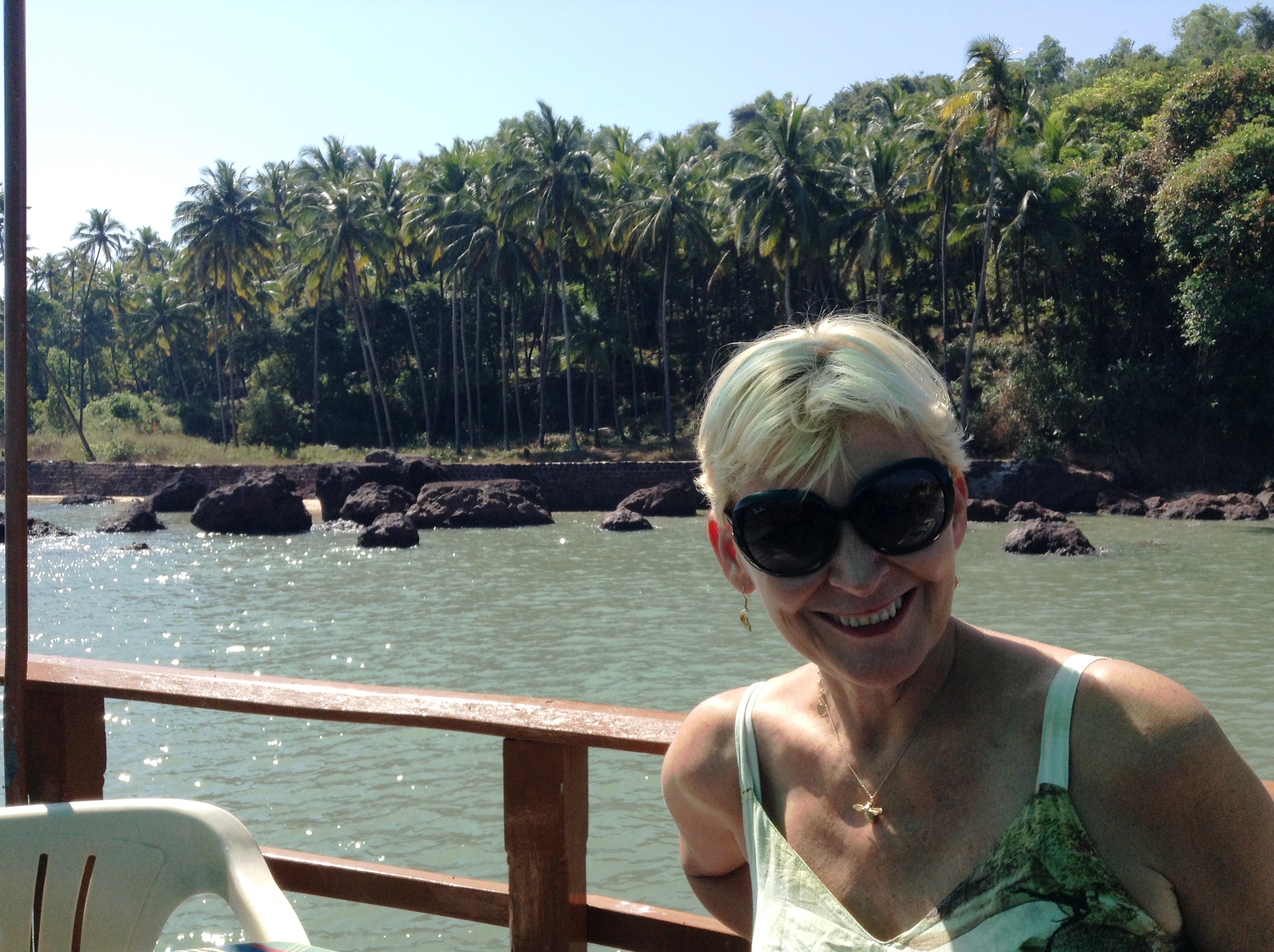 The only black fly in the ointment were a few of our fellow ‘trippers’. The four bores from London droned on and on all day about the countries they had visited, problems they had solved, fish they had eaten. Sadly our lovely little boatman kept filling up their glasses with Kingfisher beer, and rum and brandy, and they droned louder and longer. Aaargh! I tried to speak to my neighbour lady who had such OLD skin, hanging in wrinkled folds, but she ignored all my friendly attempts. I assumed she and her husband (with large piano keys teeth) were deaf. So, at the end of the boat trip, I stood up like a most put out Maggie Smith and said loudly, ‘Well, let’s leave these rude, unfriendly people,’ and suddenly old deaf ears turns and says, ‘Hope you enjoy the rest of your holiday.’ I barely acknowledged her.
