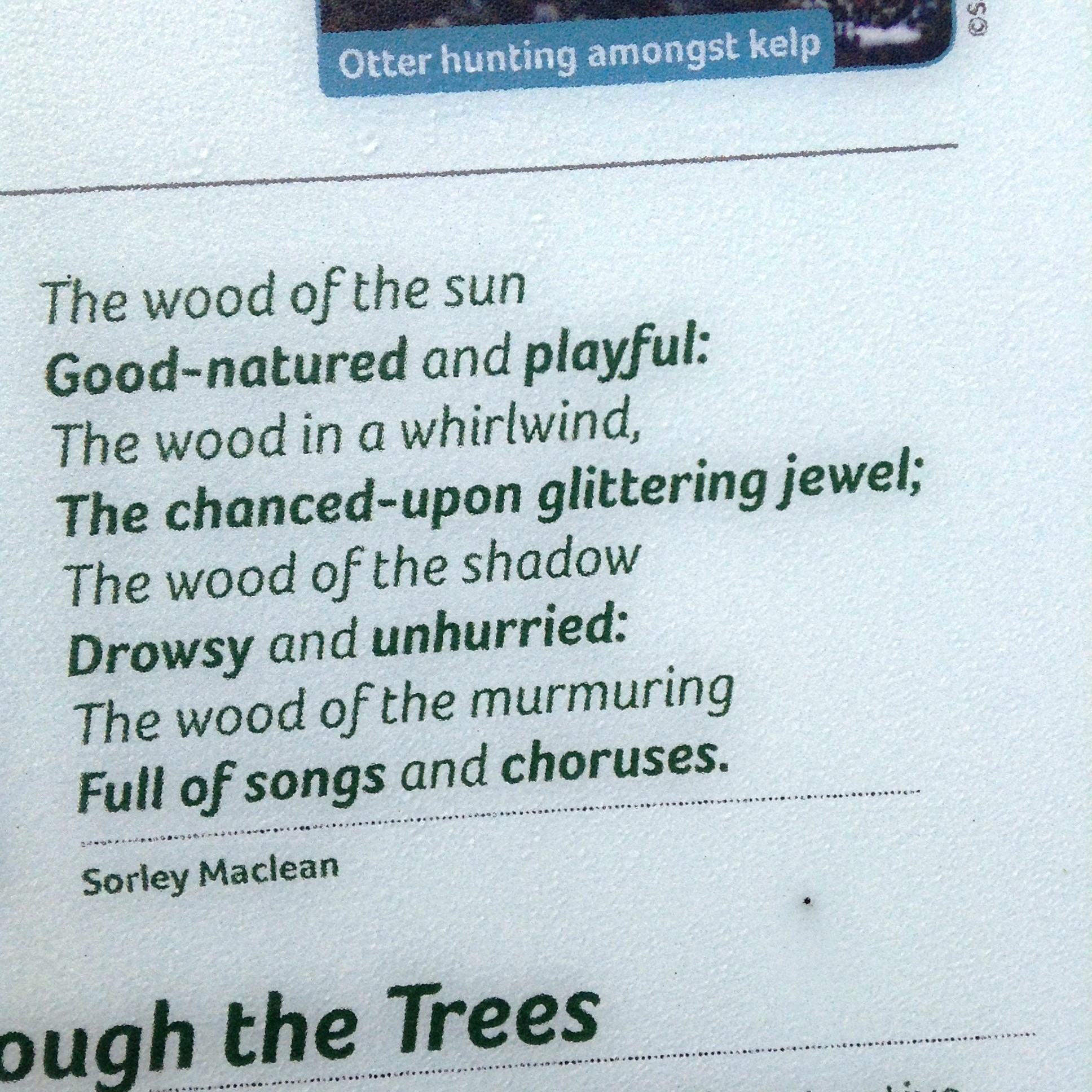 I love this poet, not that I can read and understand in the native words that he writes, but from the interpretation that our minister in Glenelg used to share with us. Mr Beaton was Skye born, and loved all poetry but when he spoke Sorley MacLean’s words in Gaelic and then translated, suddenly the smell of the bladder wrack and sea shore came to mind or the soft mosses and silvery forms of the birches were there, in front of my eyes. I love this one about