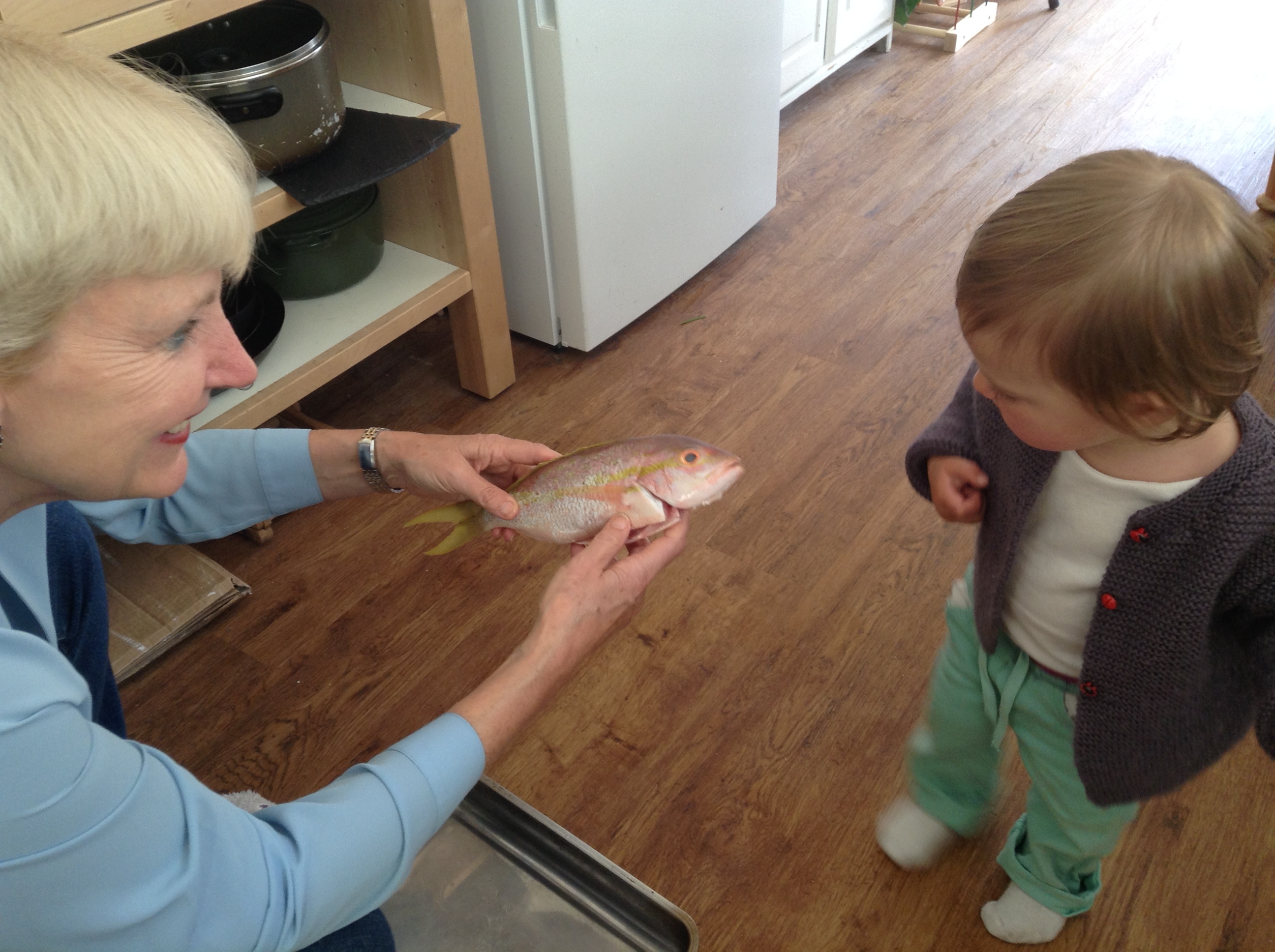 It was fun just watching her walk about, and I suddenly saw the world through her eyes. She fixes on the minutiae, the tiny insect, the snail, and everything is a miracle. We introduced her to a fish, and after looking at its eye and its teeth, and bending over to give it a very close look, she decided it was good enough to kiss. So she did!