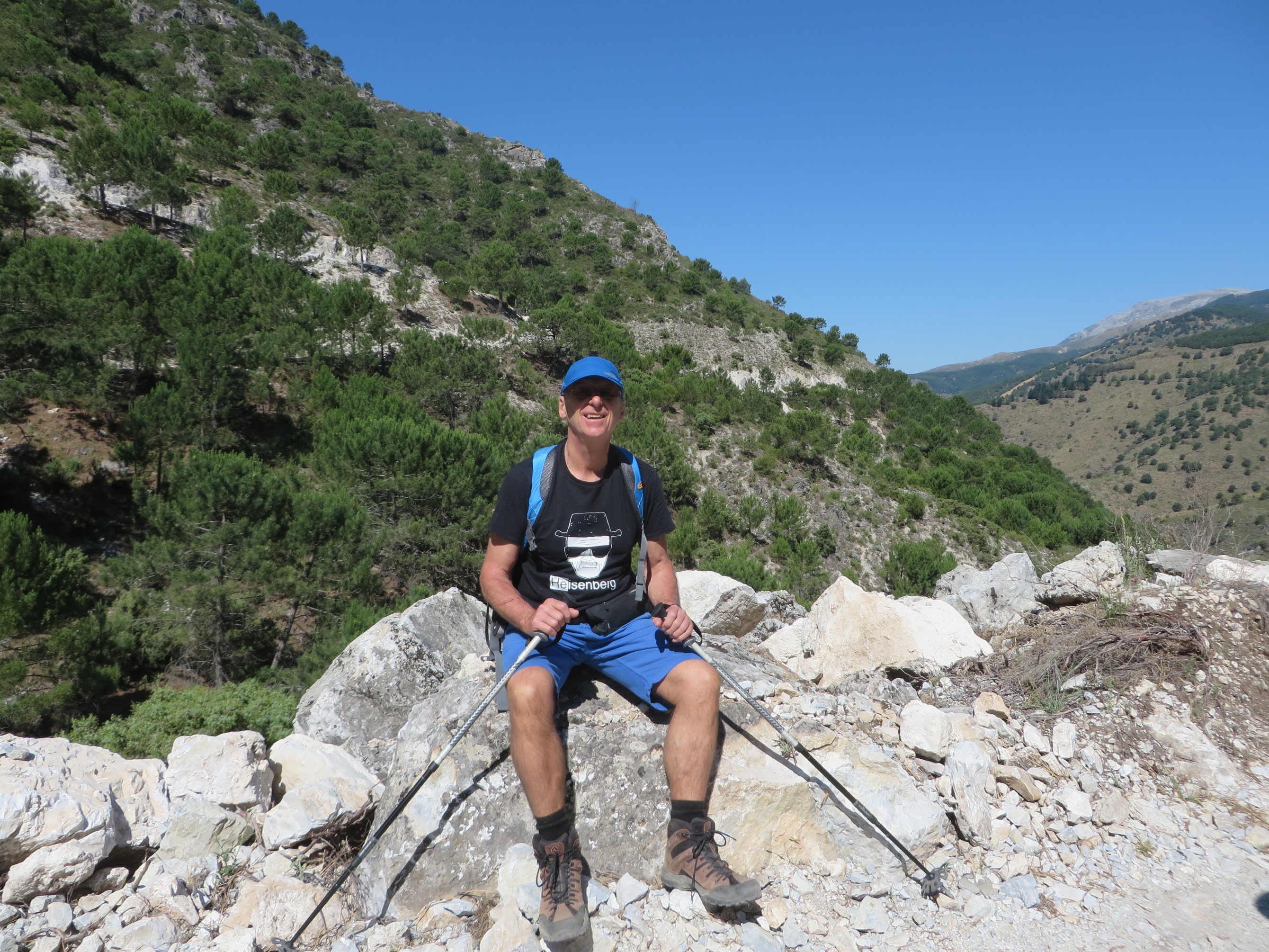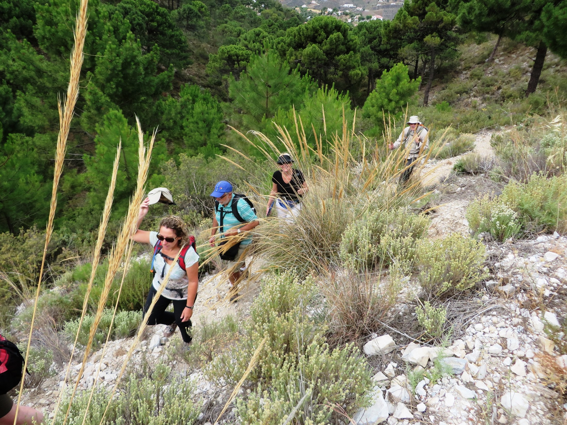 The last day we walked to Sayalonga, passing the three mountain villages that we had come to know, Canillas, Competa and Archez. We passed olives, vines, avocado, lemons and marvelled how the farmers could harvest on such steep slopes. It was all very idyllic and beautiful and very hot.