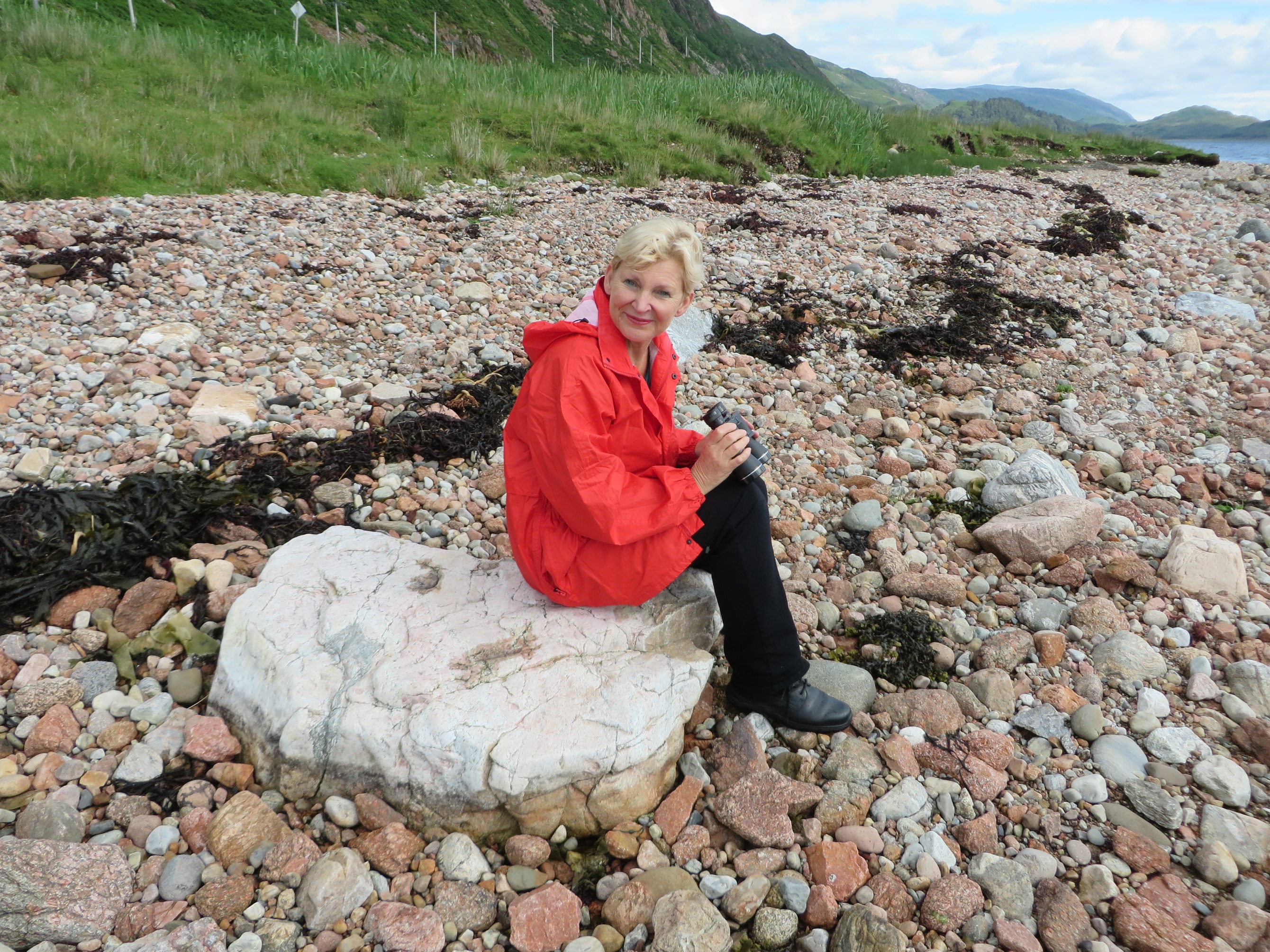 The storm clouds gathered, the rain fell in torrents, and we passed the time watching The Wicker Man, and wondered what on earth we were going to do on this bleak, deserted peninsula. The morning peeped through dramatic curtains of mist, and Natasha was inspired to paint the scene from the bedroom window. But later the sun did shine and we each pursued our own interests, some climbing up to the skyline and some foraging on the shore. It was good to be amidst the wild places again, walking past pink granite rocks and seeing the oystercatchers parade on the foreshore.