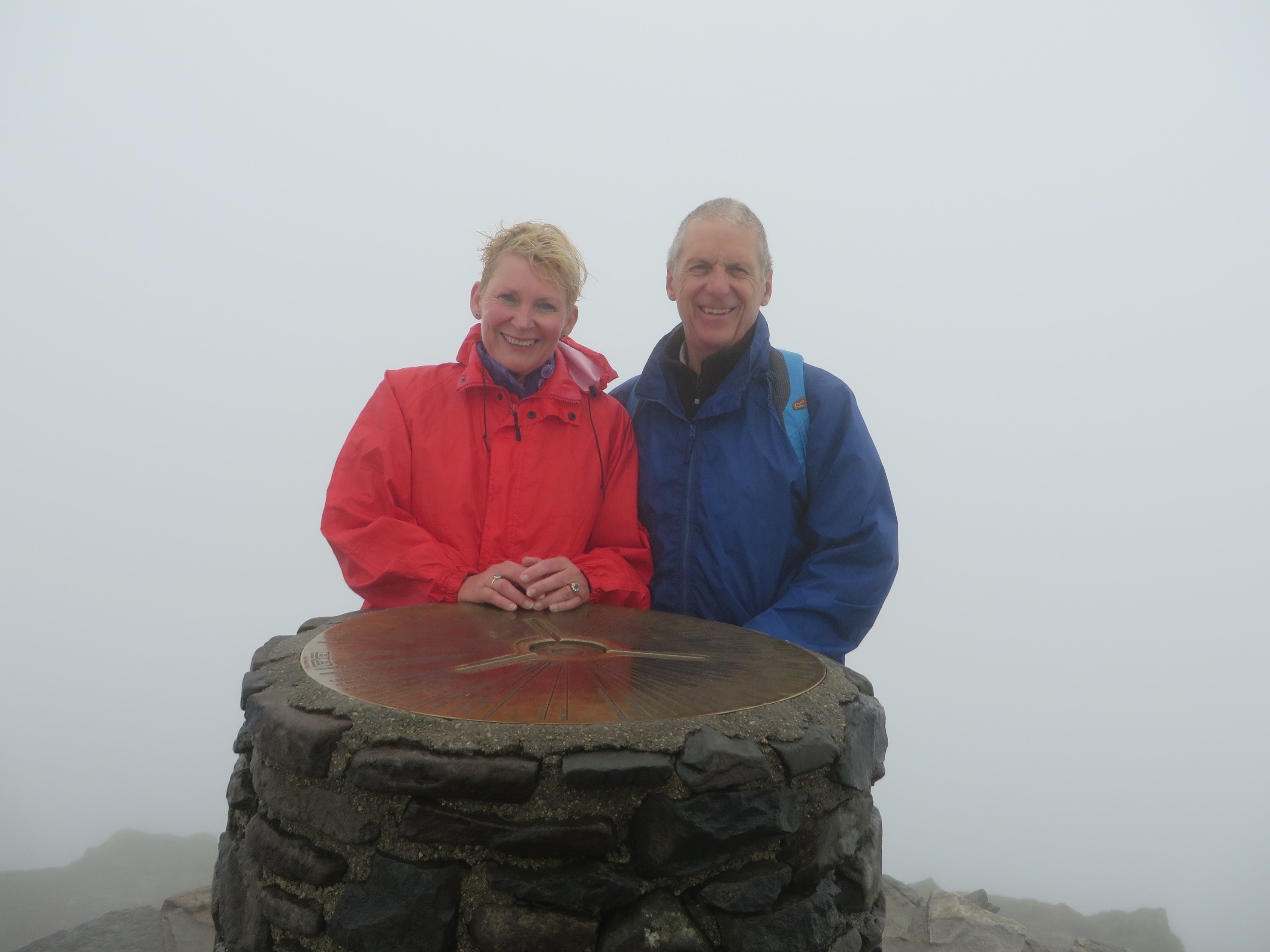 The going was good until we had to scramble up an almost vertical incline. A lot of puffing and straining to get up over the big rocks saw us eventually get to the summit and we posed in the thick mist, and saw absolutely ZERO!