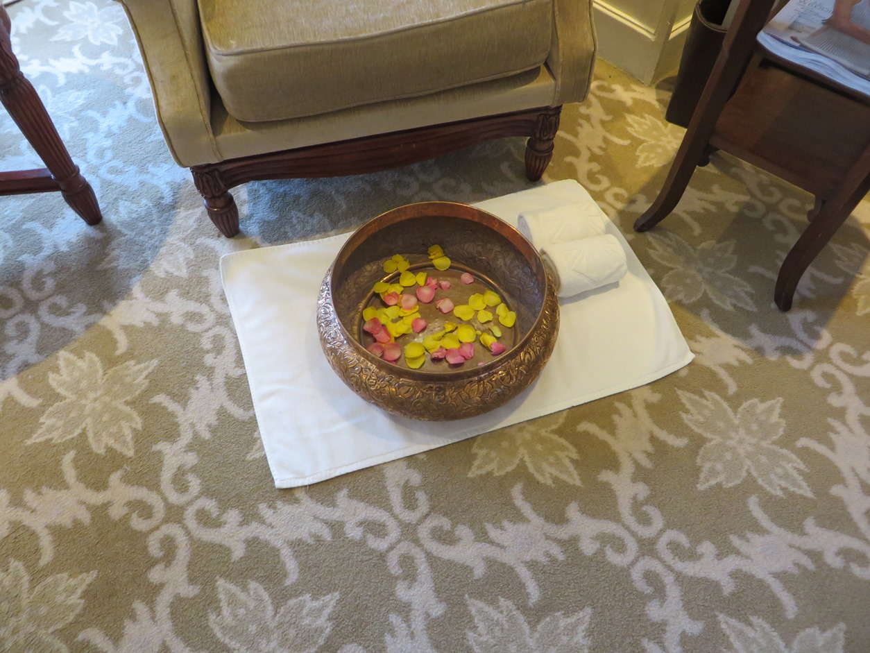 It was just as it was described in the book Shantaram, only now it is so popular that people are queuing to get in. The food was good, so we went back at night for dinner. Outside were the beggars, the homeless, the constant noise and colour and hooting. When we finally entered our hotel there was a hush – a tinkle of piano music, soft voices, and a proud lift attendant ushered us up to our floor. Our room was festooned with rose petals, and there was a copper footbath ready with special salts and creams. It was heaven on earth.