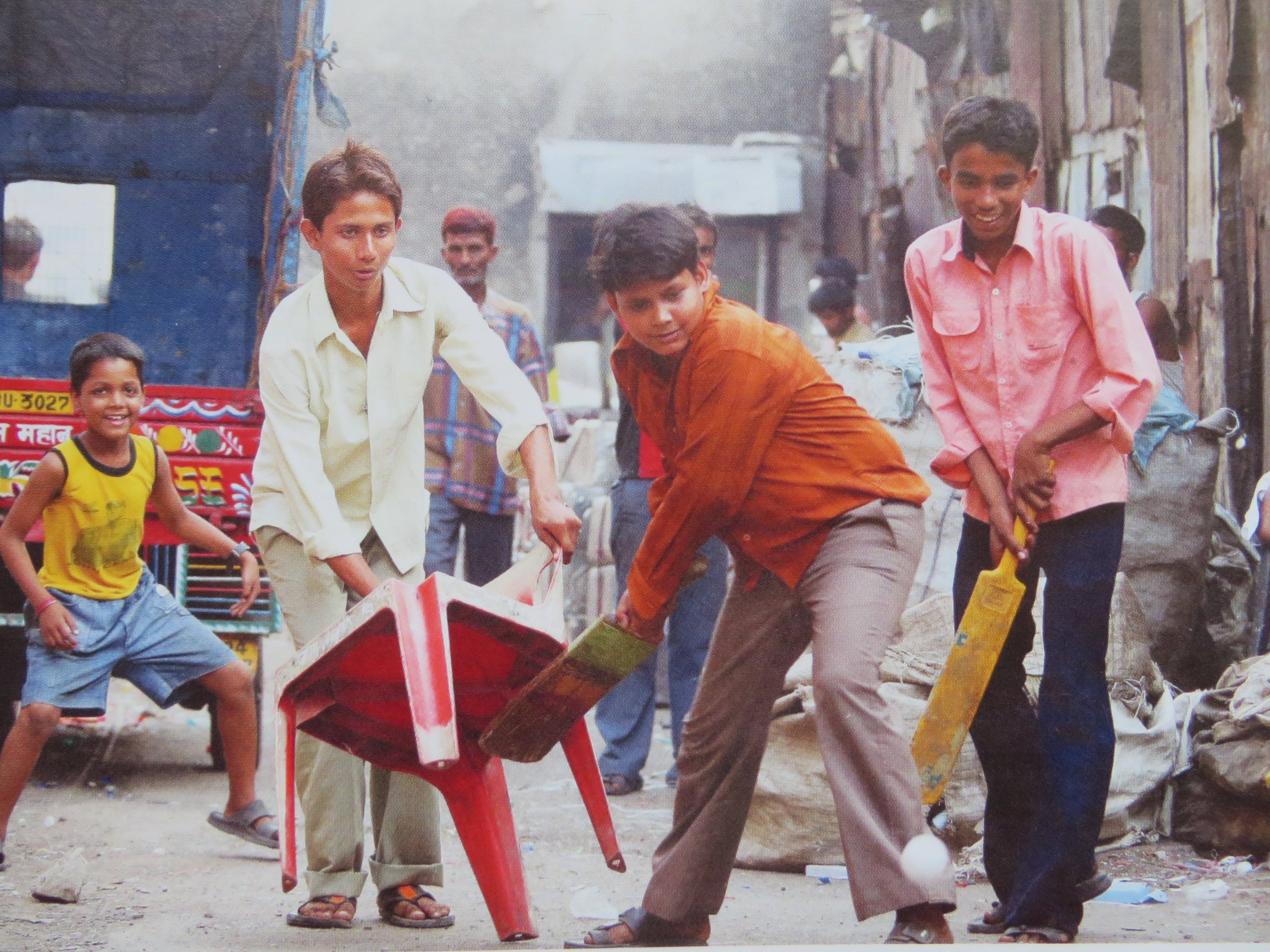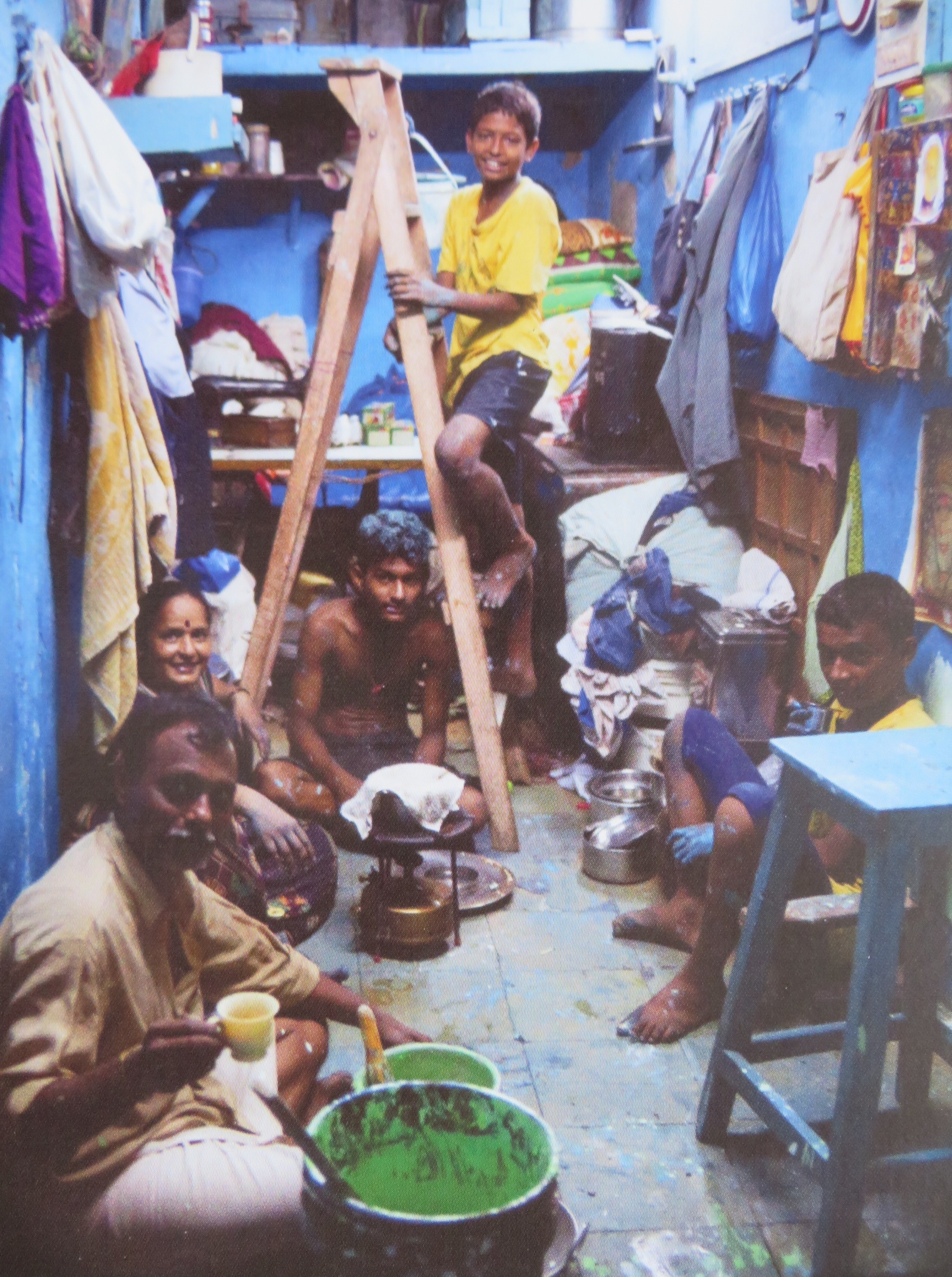 Paint tins are scoured and cleaned and refilled, aluminium is burnt and soldered and reused. When I saw the textile workers in Varanasi earlier this year I was appalled at their tiny houses, single light bulb and incredible work load, but here in the slum we saw a whole different picture. On the other side is the residential area, and we threaded our way through rooms that hold families, through tiny walkways, dirty and wet, yet inside, from what I could see, the floors were spotless, delicious smells of cooking came, and children were playing hopscotch. I had to laugh at one man, he saw us watching some plastic workers and he came out of his ‘office’ and started polishing his windows. Pity he couldn’t have hosed down the street while he was at it!