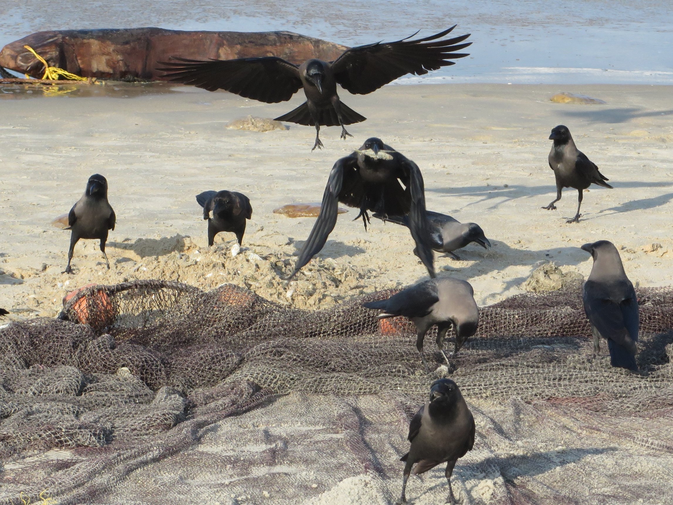 Shiva was very intent on telling me that John is a true gentleman. ‘Birds and insects fight, not like John – he is a gentleman.’ We heard that the common crow is a vehicle of the god, Saturn, and they are renowned for taking away the souls of the dead. In all cultures they are depicted with death, and I seem to remember O Henry writing a story about a raven (member of the crow family), and there were a flock of crows gathering around the death scene of Zorba the Greek. But here in India I associate them with fun, with lovely skipping jumps around the tide line, their funny poses on flag poles. Mind you, just the other day we watched a flock bring down a kite, chasing it relentlessly for a fish it had caught.