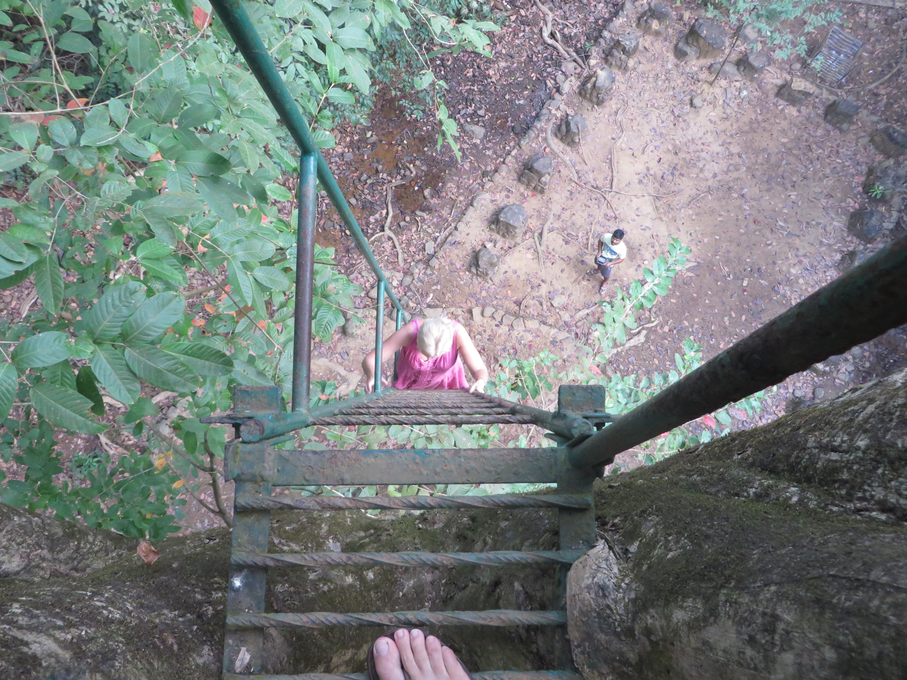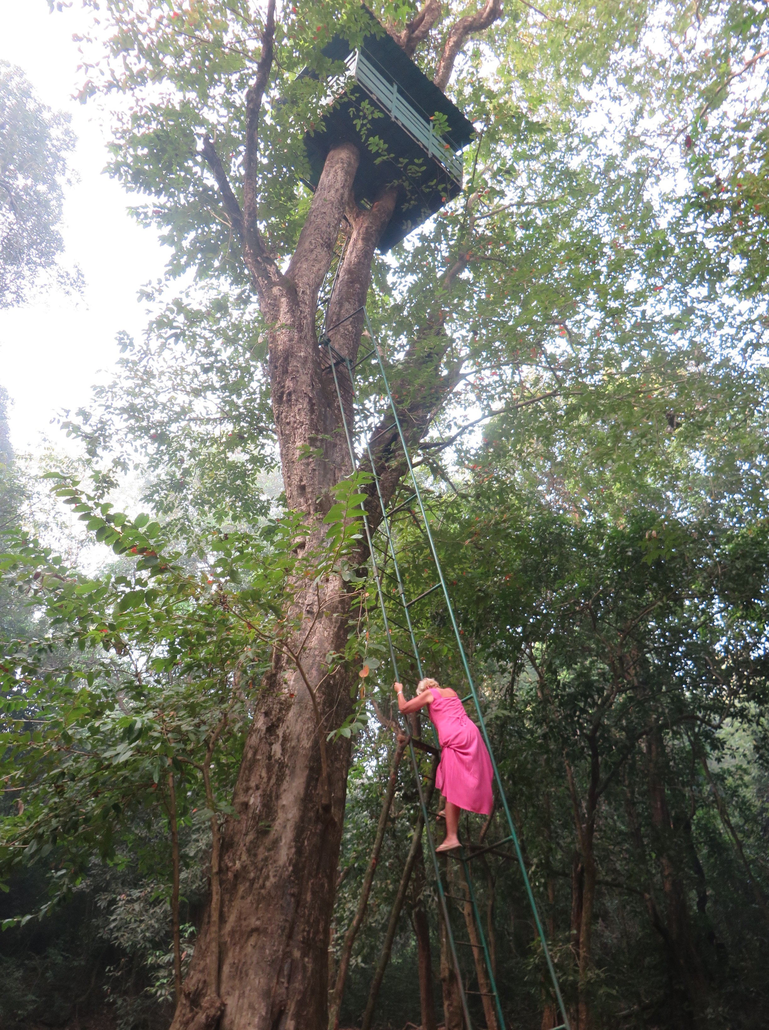 After about a mile and a half we reached a clearing and a giant tree that had an iron ladder leading straight up 100m to a bird/animal watching lookout tower. Anthony told us to ‘get up there’. We did. Two elderly folk (!), and it was like climbing up to the Big Top in the circus.