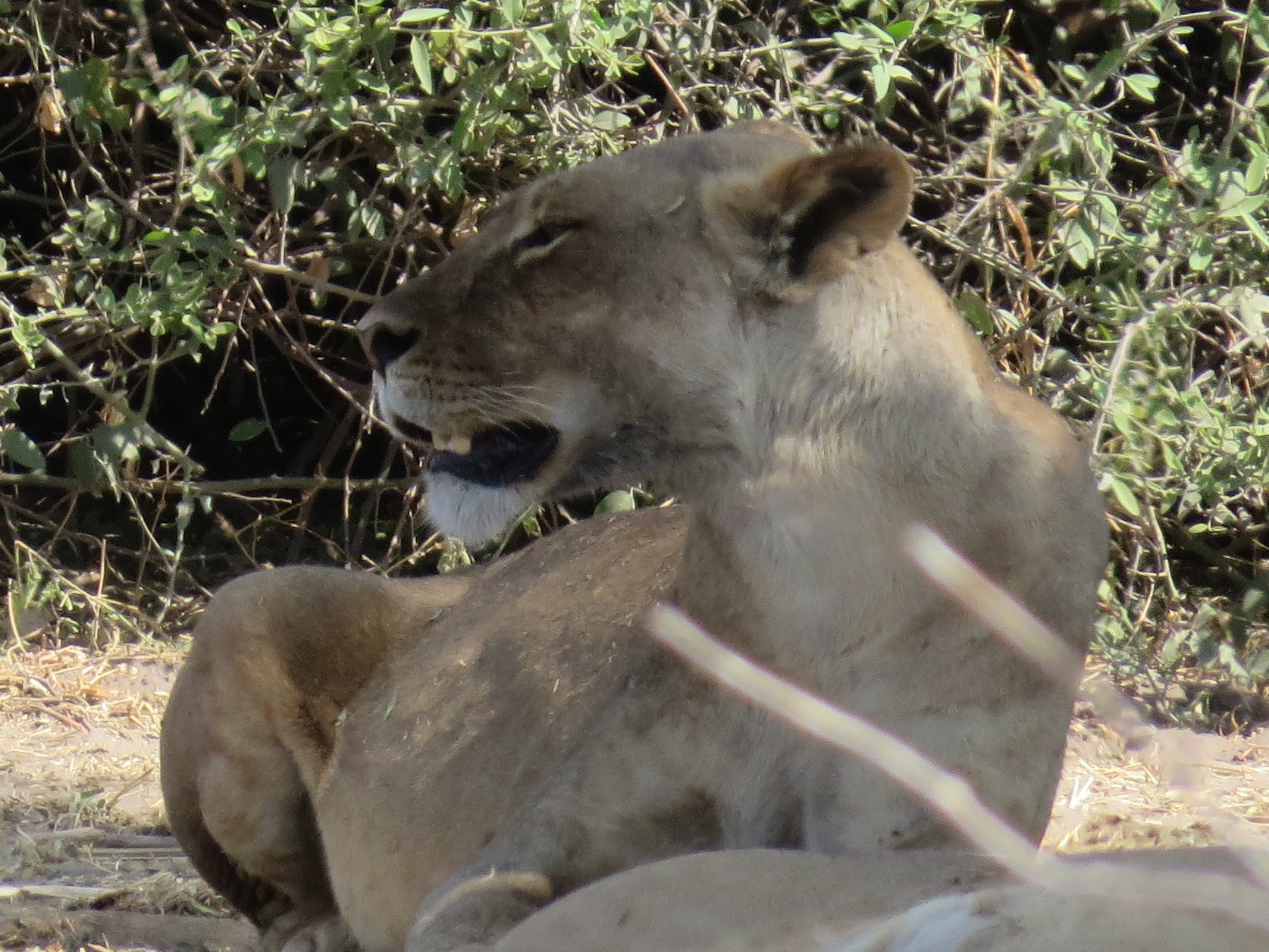 Bibi drove one more time along the shore path when suddenly one of the men on our group called, ‘Stop! – behind us!’ And Bibi turned, Oh my God! A pride of lions ambled down and sat by our car. The cubs went ahead with one female and frolicked in the shallow water, the young male sat quiet and two females came out of the bush, obviously limping. Another female had a deep gash on her shoulder. It had been a serious encounter, Bibi thought. Either a buffalo or a male elephant.