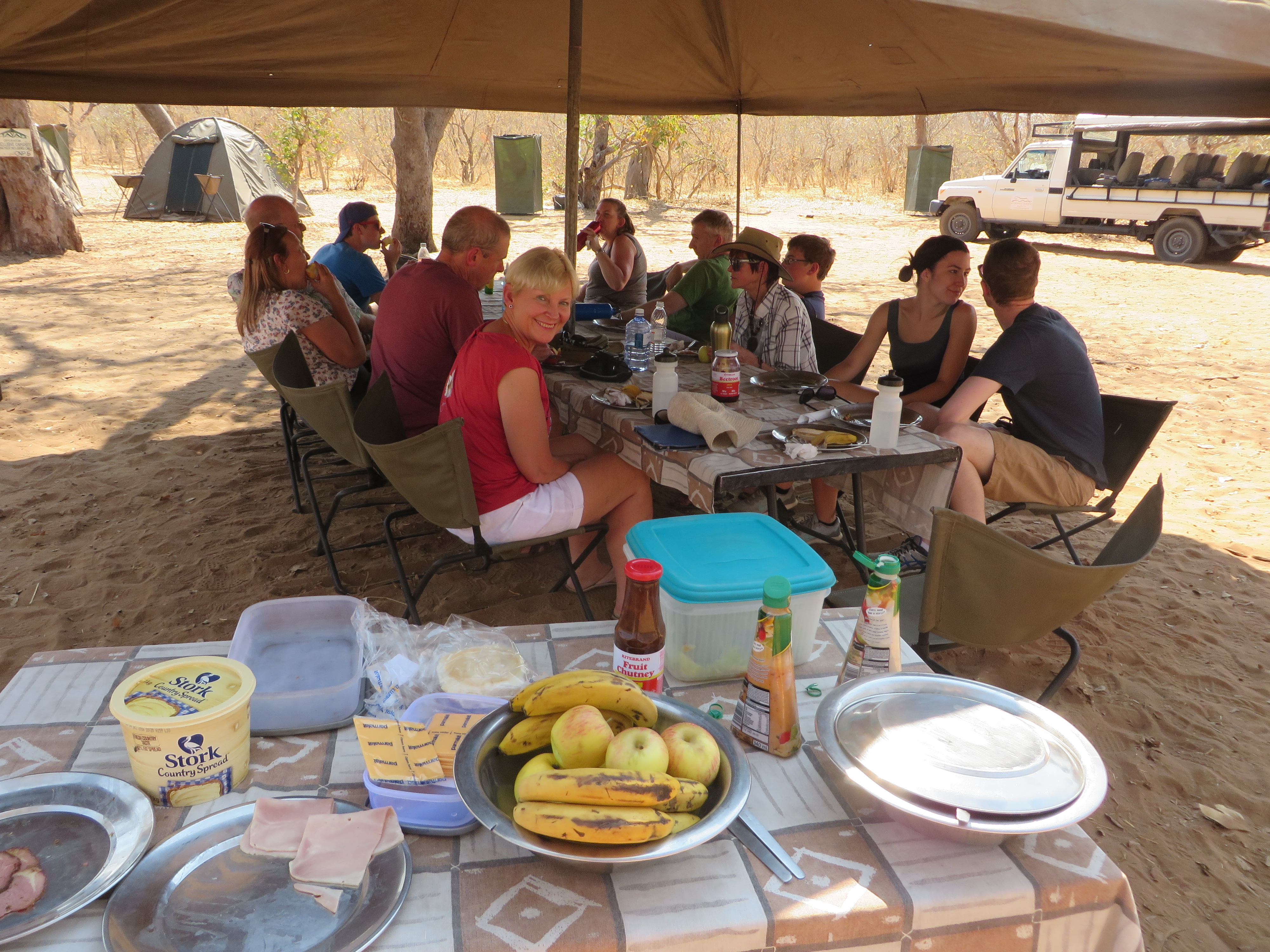 When he had collected ‘his flock’ we hurtled on our way, calling into supermarkets called Choppies and Spar (!) and then after half an hour of further driving he pulled over and reduced the pressure in the tyres. We would not be on tarmac for another 7 days. Only sandy tracks and deep potholes as we would soon find out. We had bought enough water to last and Bibi had bought the food for all our meals. He would not only be our driver but our cook as well.