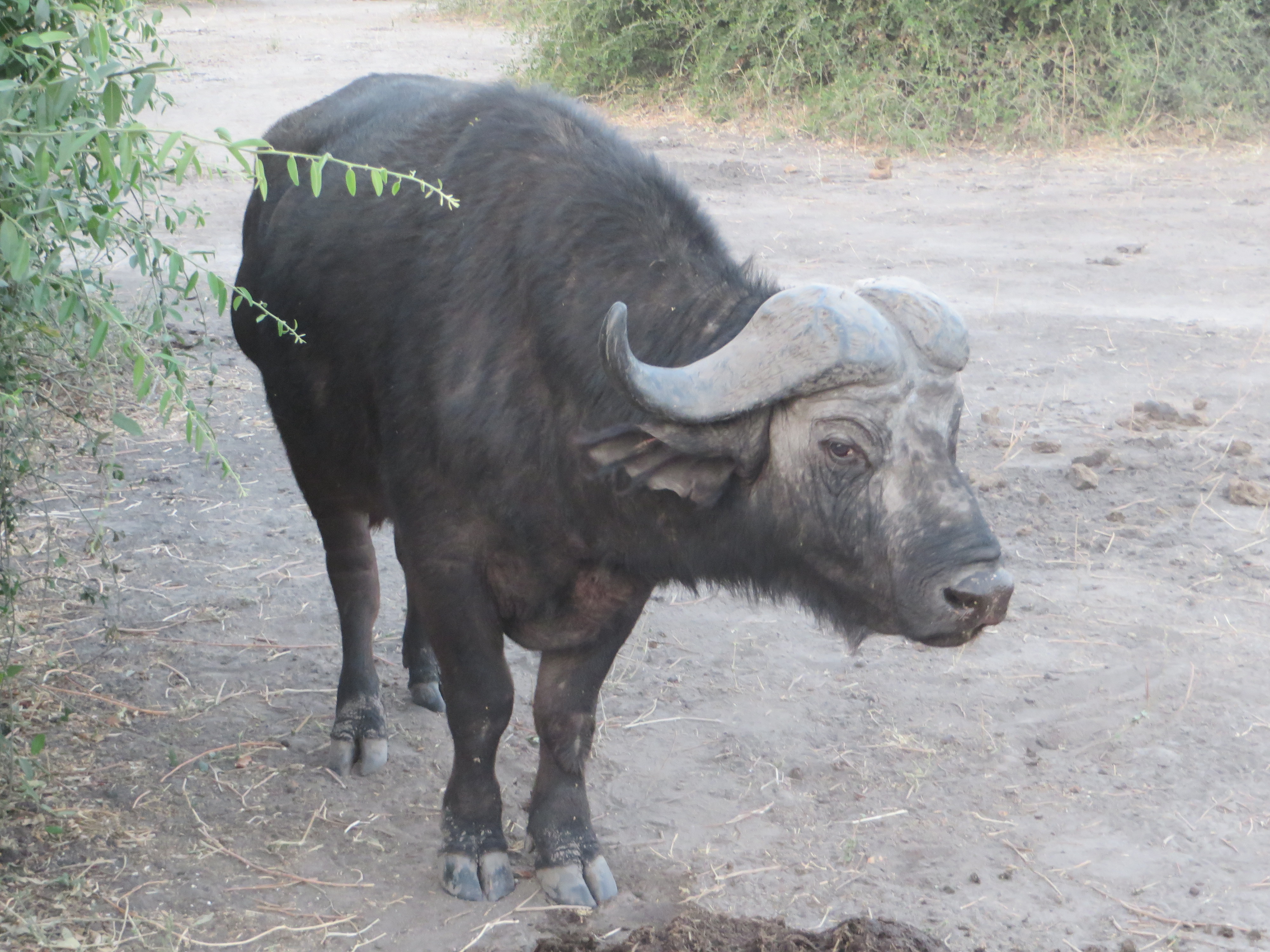 the bushes rustled and out lumbered the largest bull elephant with three females in attendance. He looked at our truck, and instead of plodding on to the water where the egrets and hippos were wallowing he turned instead to us. He obviously had taken a dislike to our vehicle, maybe saw it as a threat so he came round to the driver’s side, his massive ears flared out and his trunk went out like a rigid pole. Bibi immediately revved his engine and reversed. He stopped. The elephant conceded the respect shown to him and continued on his way to the river. We were very scared, and rightly so. Bibi said he could have charged.