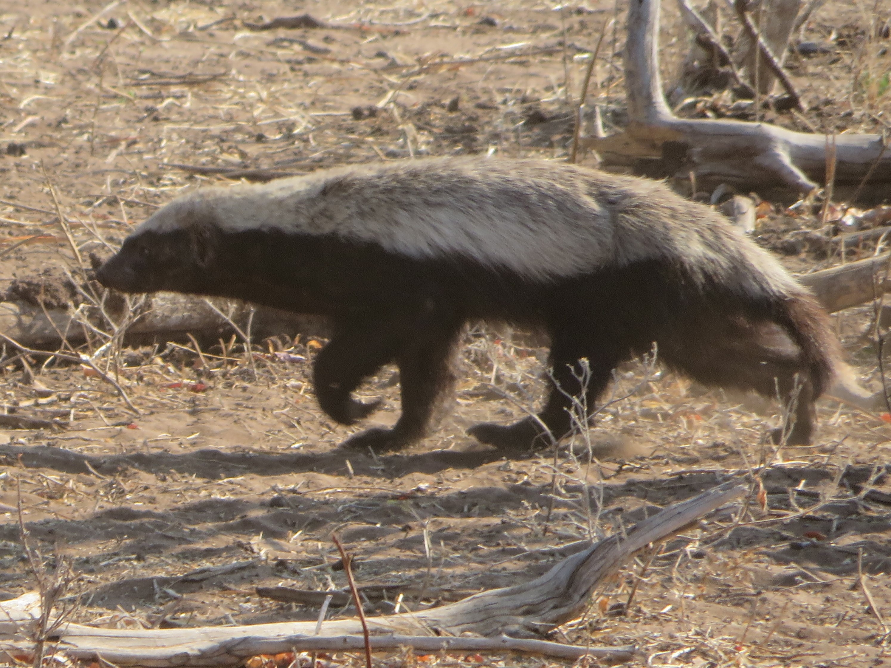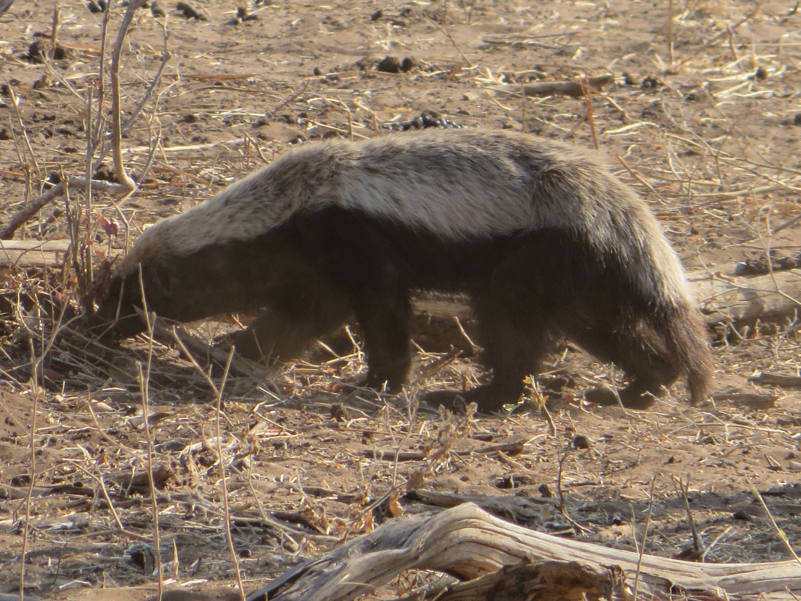 In the morning Bibi told us a honey badger and perhaps a jackal had been scavenging around. The morning safari revealed the honey badger in the flesh.
