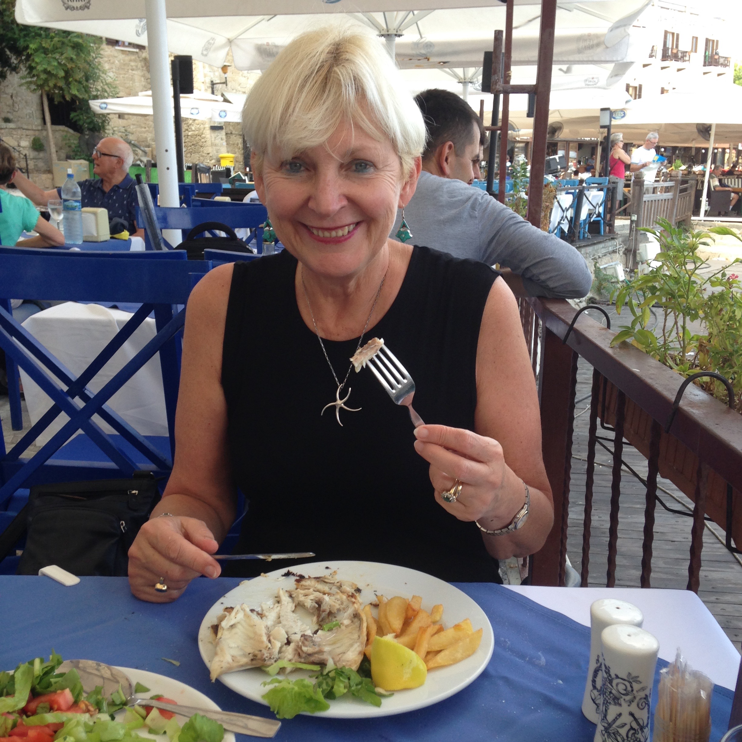 My best cycle run is to Cyprus Gardens. It is along the coast and was derelict when we came across it the first time, nearly five years ago. Now the holiday cottages are dazzling white, trimmed with blue, and the pool is clean and plump tourists lie with legs akimbo and simmer and shimmer all basted in shiny oil. It is also a casino, but we are a little afraid to venture into those doors. Instead we sit beneath an olive tree and sip beer and look out at the dazzling sea. Sometimes I feel like a character out of Tender is the Night and sometimes I pretend I am Jacqueline Onassis, in my own private world. I think it is my favourite place.