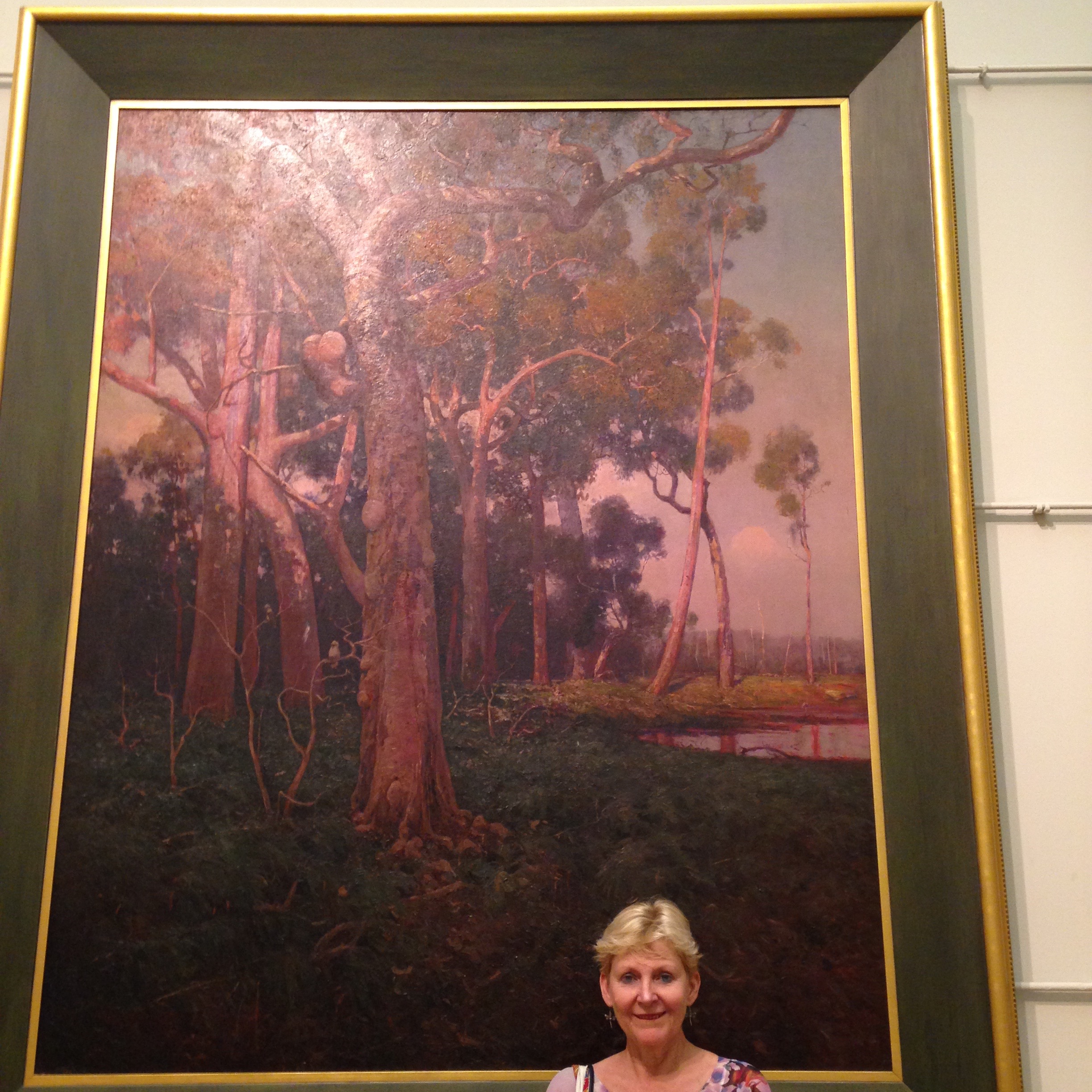 All familiar but so good to revisit. We walked through the Botanic Garden and came to the National Art Gallery. My next task was to find a Van Heyson, the man who painted gum trees and lived near Handorf in the Adelaide Hills. He also did fabulous work in the Flinders Ranges. And there, on the back wall was the man’s mighty masterpiece, and of course, its subject was trees. Henry put my head and shoulders in, like a little groupie that has to be in on the act!