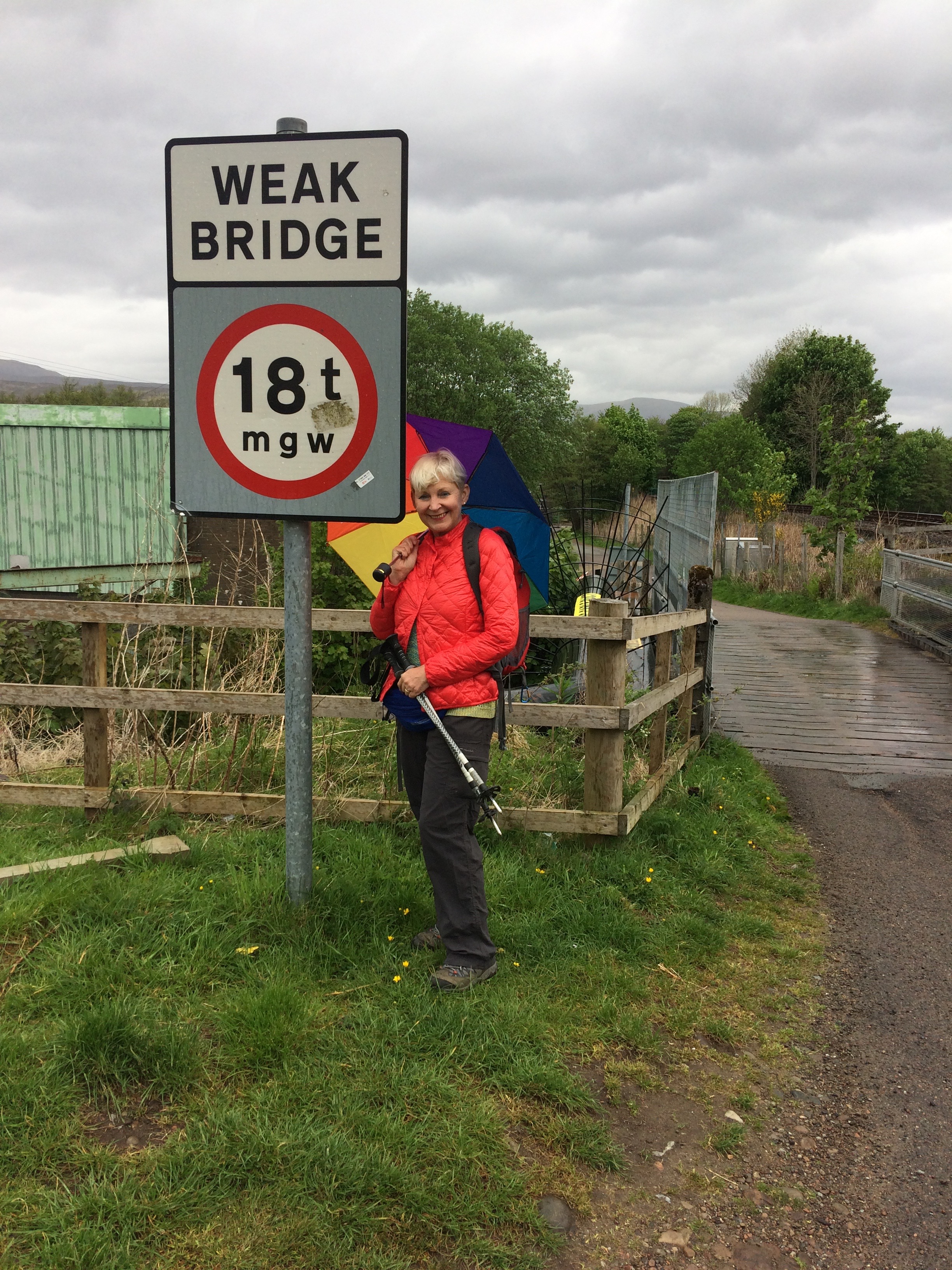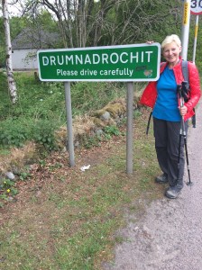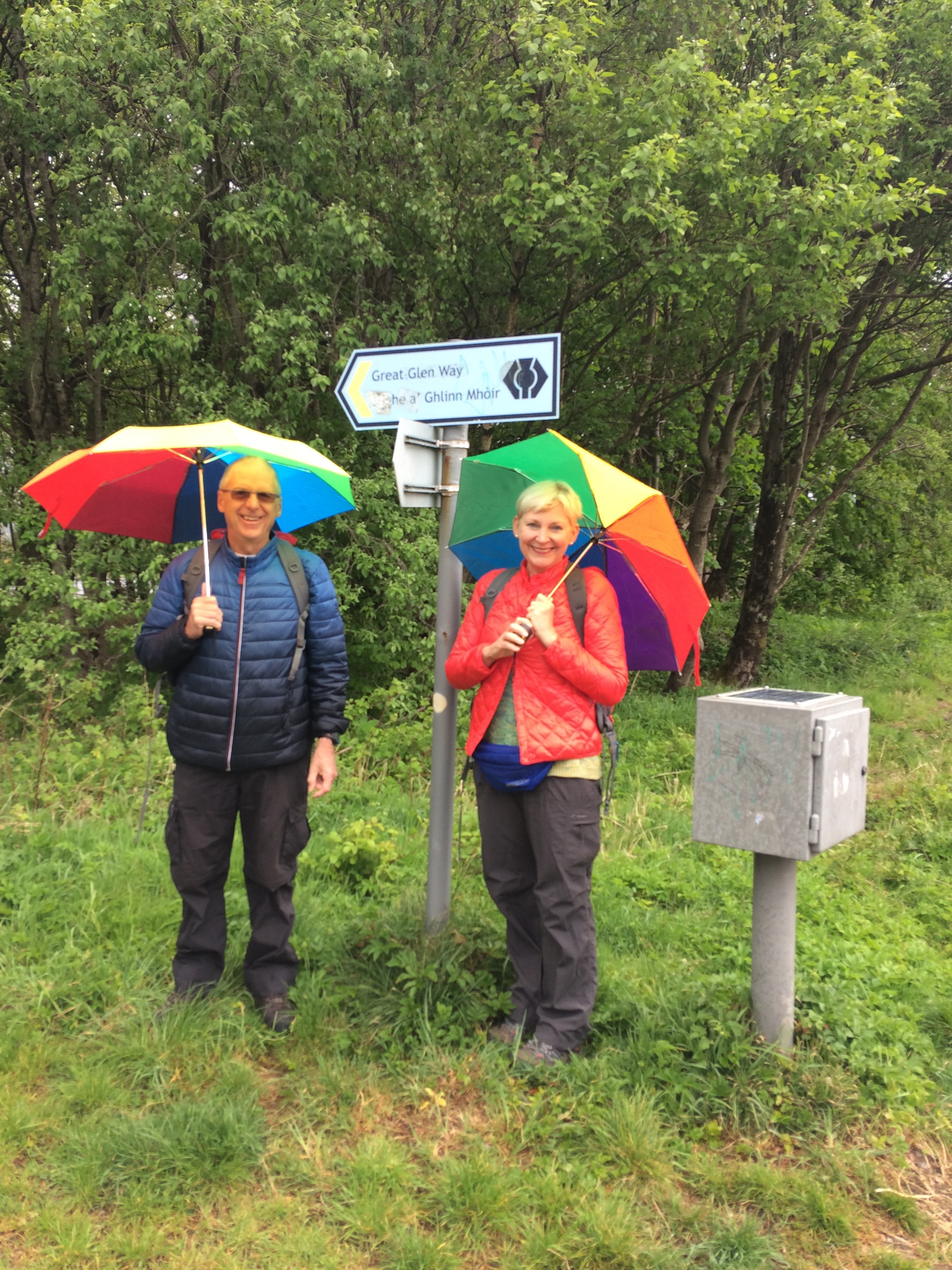 We left Fort William in the drizzle, the mighty Ben Nevis obliterated by cloud, but we had a spring in our step. It was good to leave the houses and town behind and smell the grasses and pungent coconut odour from the gorse. The drizzle grew heavy and we stopped in Caol to put on our rain gear. We hung about as we watched the local primary school out on a ‘field trip’ with their enthusiastic teacher drawing attention to the signs of the shops. ‘Can you read that one, Hamish? Yes, that’s right, it says hairdressers, and now what about that one?’ and so on. We got to the end of the row and we saw ‘Alcohol Counselling’. Never mind the rain, I had to see how she would handle that. She was very good. ‘Now, this is where people go if they want to talk about drinking alcohol a little bit too much.’