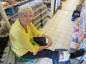 It was too hard, too sore, and the prospect of the forthcoming cities and ferries was just too daunting, so we booked a flight home. The airport was amazing, kindly porters, and I felt very looked after. Just the general public were a worry, as they bashed into my leg in their hurry to pass. I took to fending them off with my crutch.
