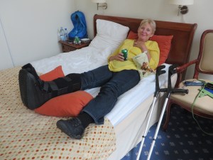 Just past the Nyhaven port hubbub I spied a corner shop, and nipped down the four or five stone steps to the entrance. I slipped and fell, and heard a sickening snap. I knew something horrible had happened to the ankle. John demanded ice and water and soon I was sitting on an upturned crate and waiting for transport to the A&E. X-rays showed a clean break and I was fitted with a Moon Boot and crutches and that was that. Five weeks for it to heal apparently.