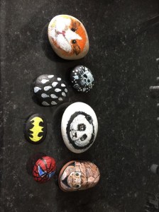 Irene brought along samples of her amazing new hobby. Stone painting, on stones found on the beaches of Findhorn. She started with dots, then went on to dogs and animals and then made a great attempt at my three little grand daughters. I told her she should go to Udaipur in India and study with the great masters who specialise in miniatures, painting with camel’s eyelashes.